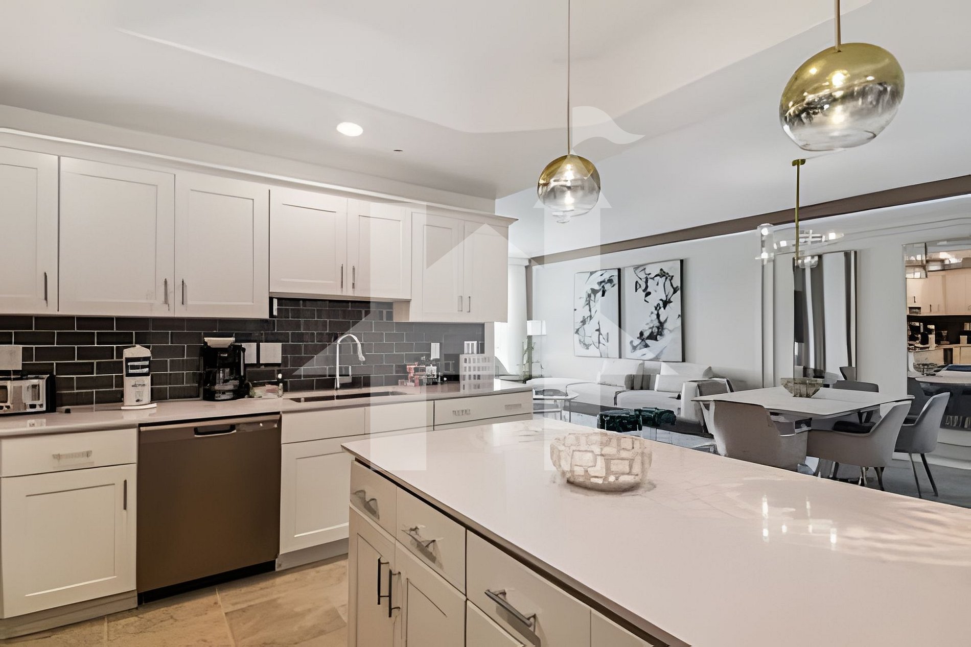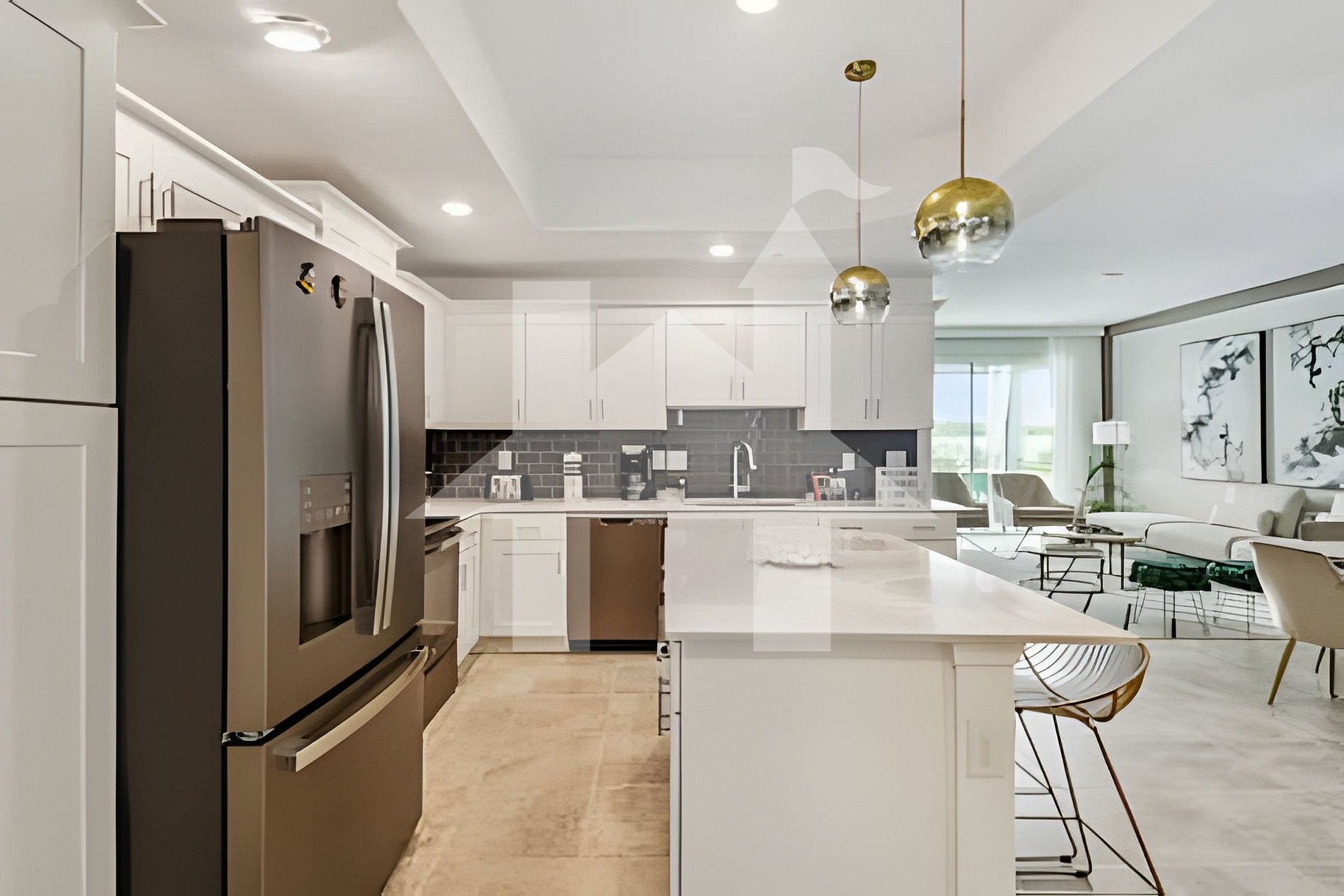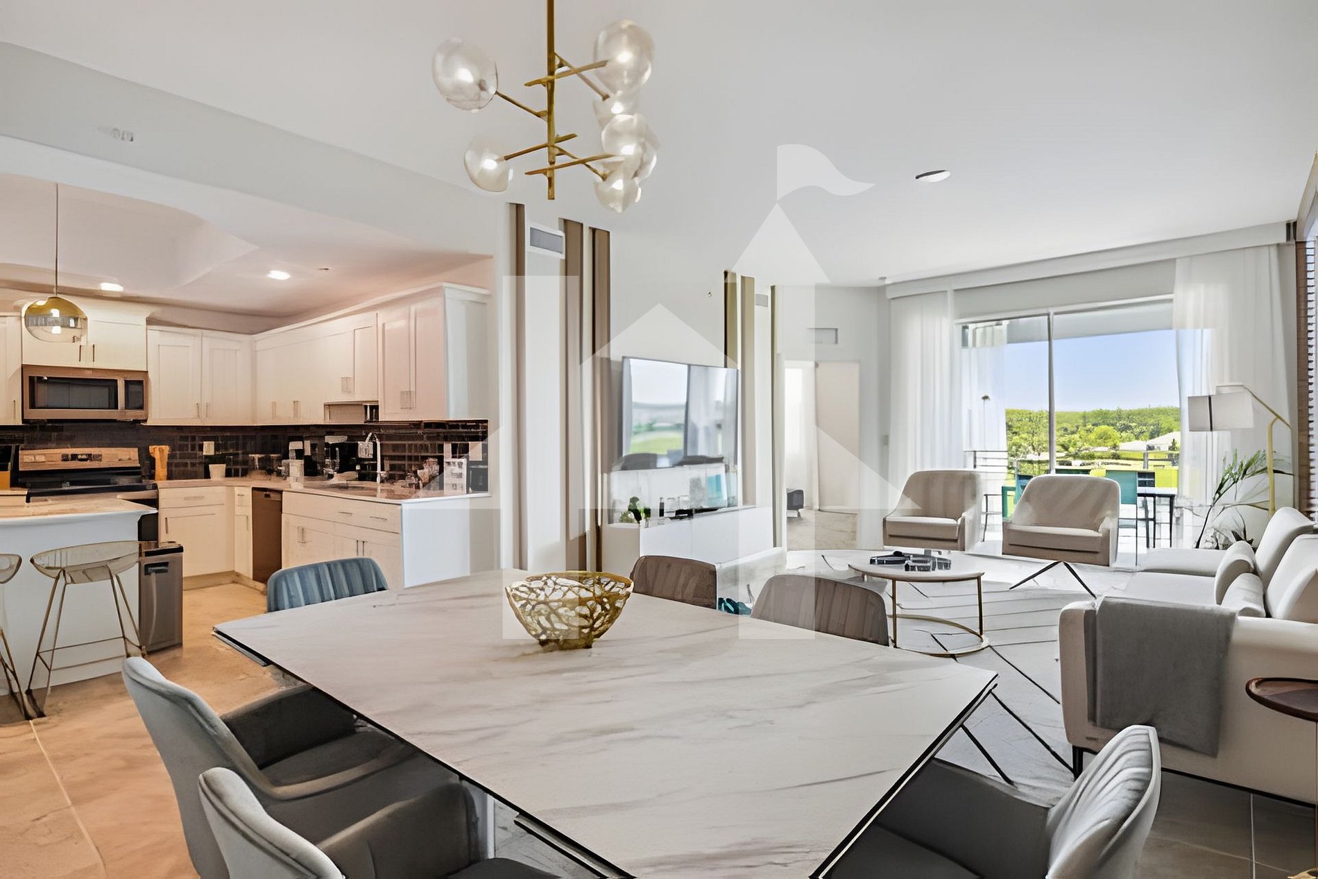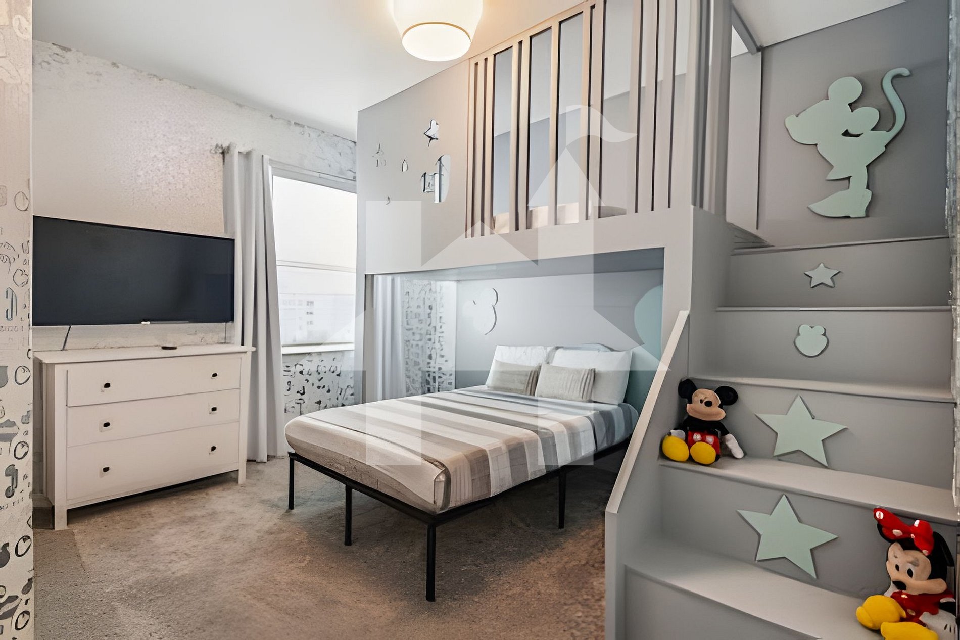 Inside the Condo Living Room: Spacious with a 65” Smart TV, 6-seat sofa, and access to a screened balcony. Dining & Kitchen: Dining table for 6 + breakfast bar for 2. Fully equipped kitchen with modern appliances. Bedrooms: Master Suite: King bed, Smart TV, private bathroom. Queen Bedroom: Queen bed, Smart TV, shared bathroom. Mickey-Themed Bedroom: Bunk bed (Full + Twin), Smart TV, shared bathroom.