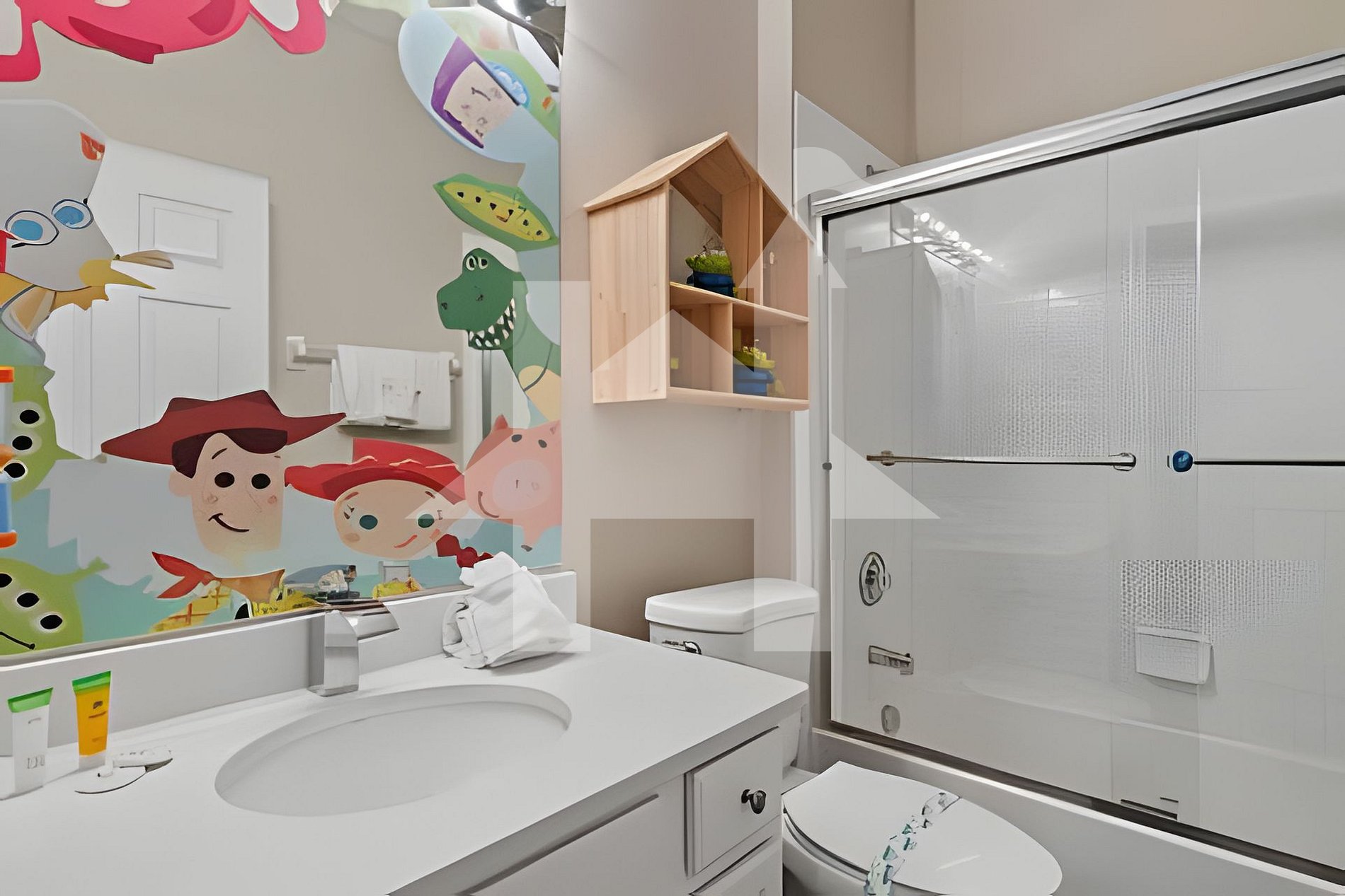 Relax in themed bedrooms (Toy Story & Mickey) and access resort amenities including water park, pools, fitness center, and clubhouse for the ultimate family getaway.