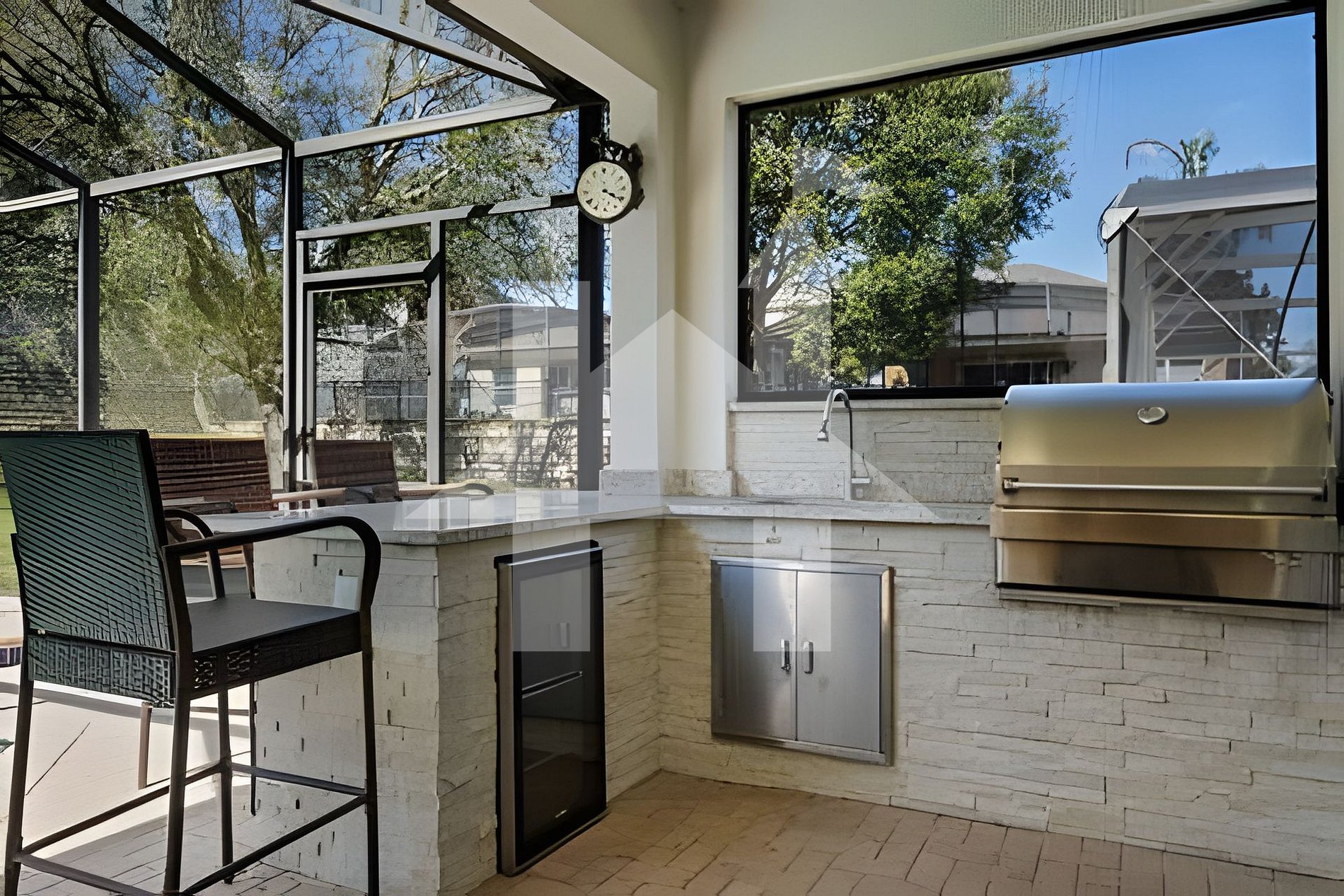 Relax in your private screened-in pool area with loungers, dining table for 6, and a covered lanai. The outdoor Summer Kitchen features a charcoal grill and beverage cooler for perfect BBQ nights under the Florida sky.