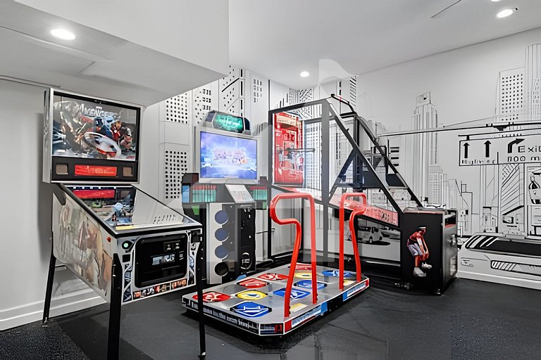 Enjoy a private pool, Avengers-themed game room with arcade machines, and fully equipped kitchen in a modern open-concept layout.