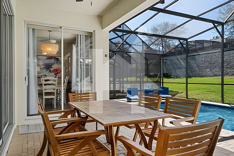 Relax in your private screened-in pool area with loungers, dining table for 6, and a covered lanai. The outdoor Summer Kitchen features a charcoal grill and beverage cooler for perfect BBQ nights under the Florida sky.