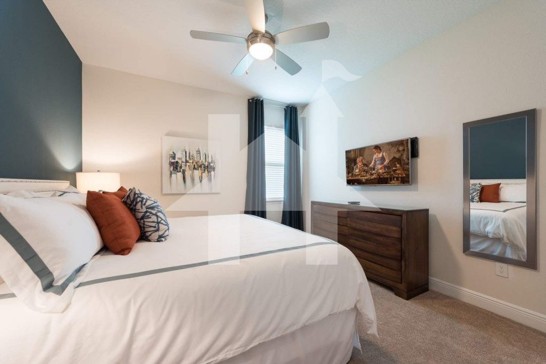 • Bedroom 2: King bed, TV, fan, shared full bathroom