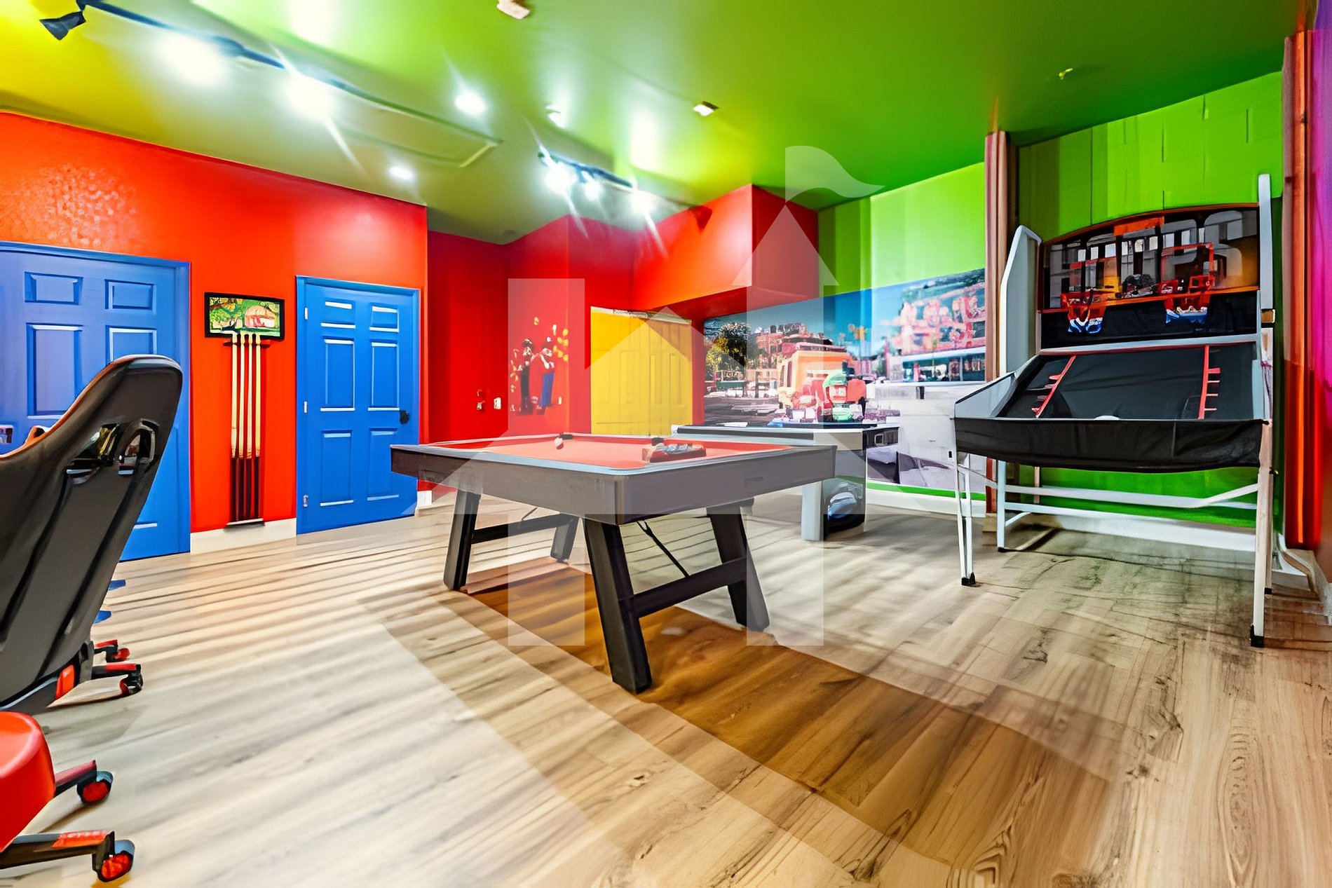 - Entertainment-Packed Game Room: The highlight of this home is the Mario Bros Game Room, packed with entertainment for both kids and adults. This air-conditioned game room features an exciting array of arcades, including The Fast & The Furious Arcade, Street Fighter Arcade, Pacman Arcade, Mortal Kombat Arcade, Pool Table, Air Hockey Table, and a Basketball Shoot Machine. Relax in one of the two gaming chairs or kick back in front of the big Smart TV for an immersive experience.