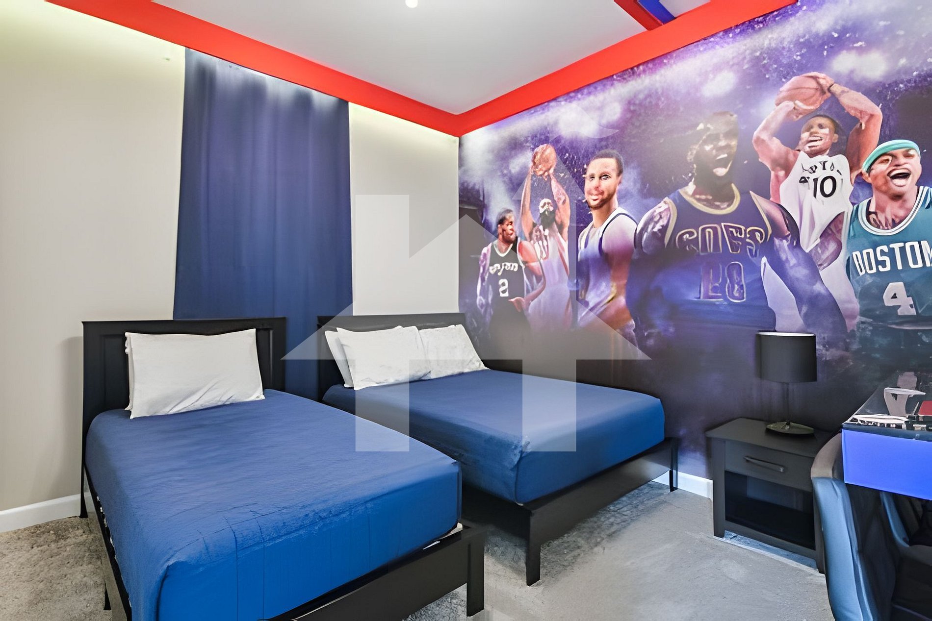 Bedroom with queen bed and TV, sharing a full bathroom “NBA” bedroom with twin + full bed, arcade, and TV