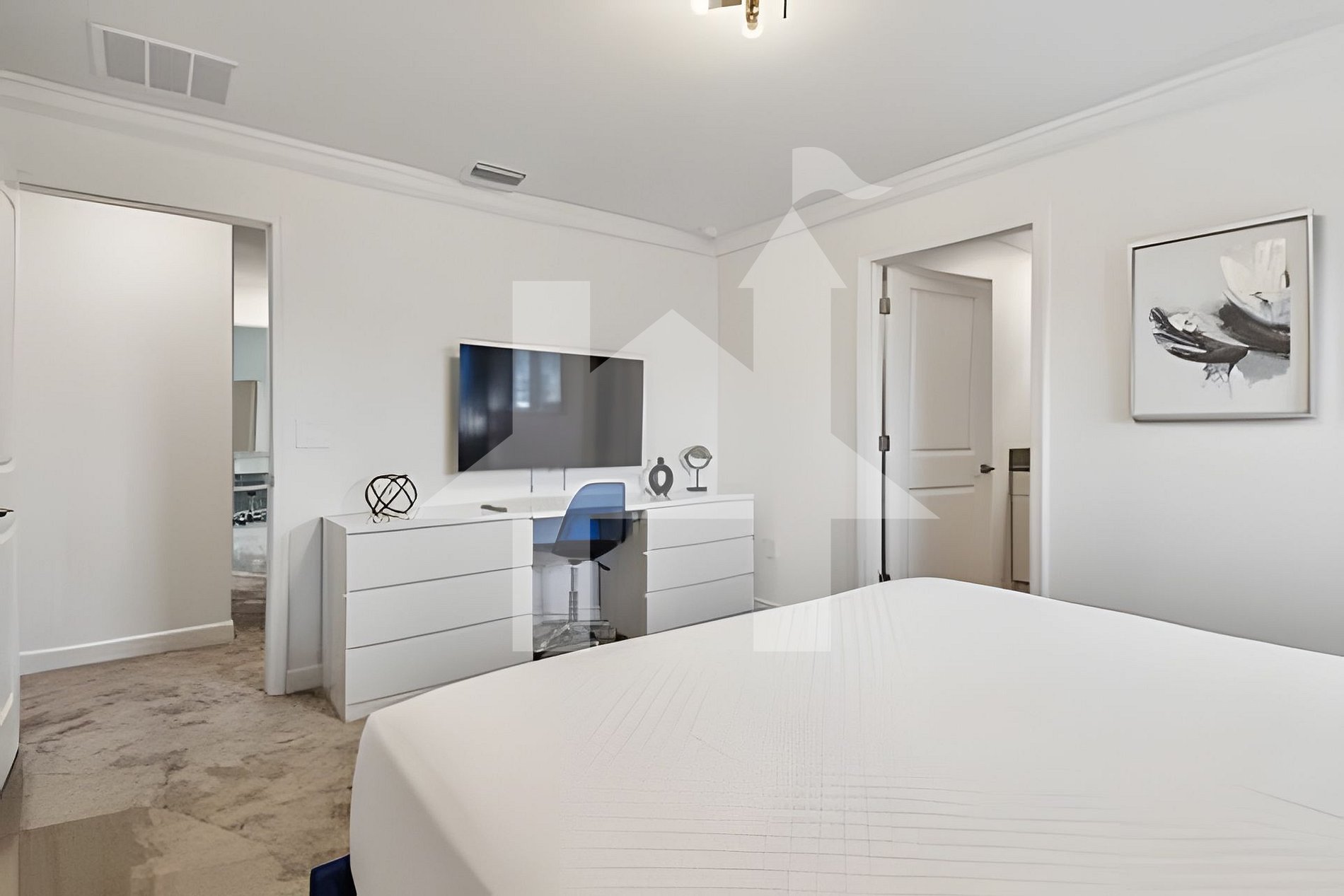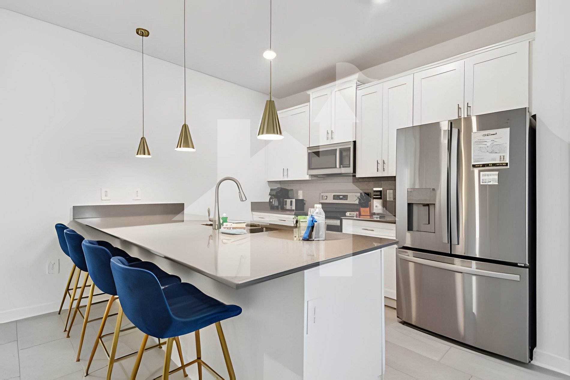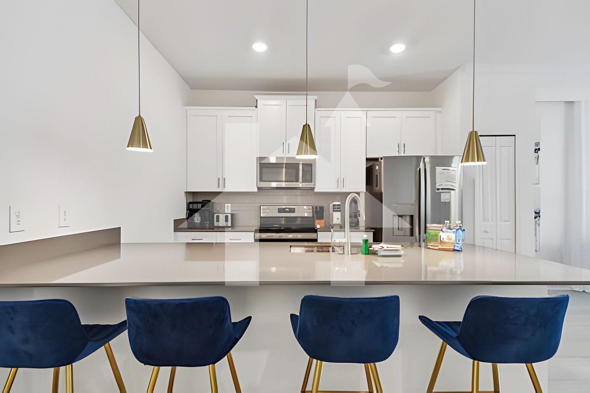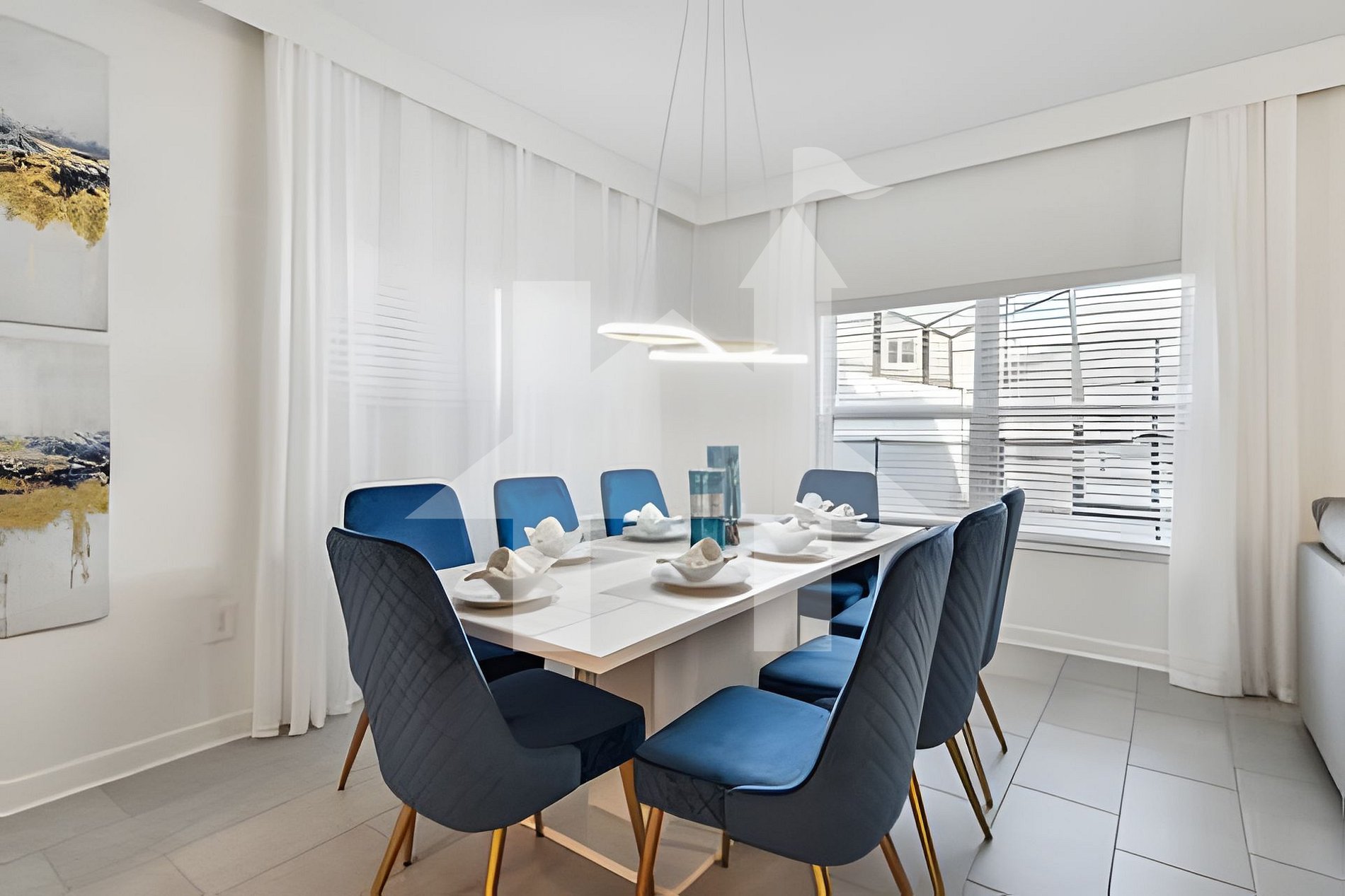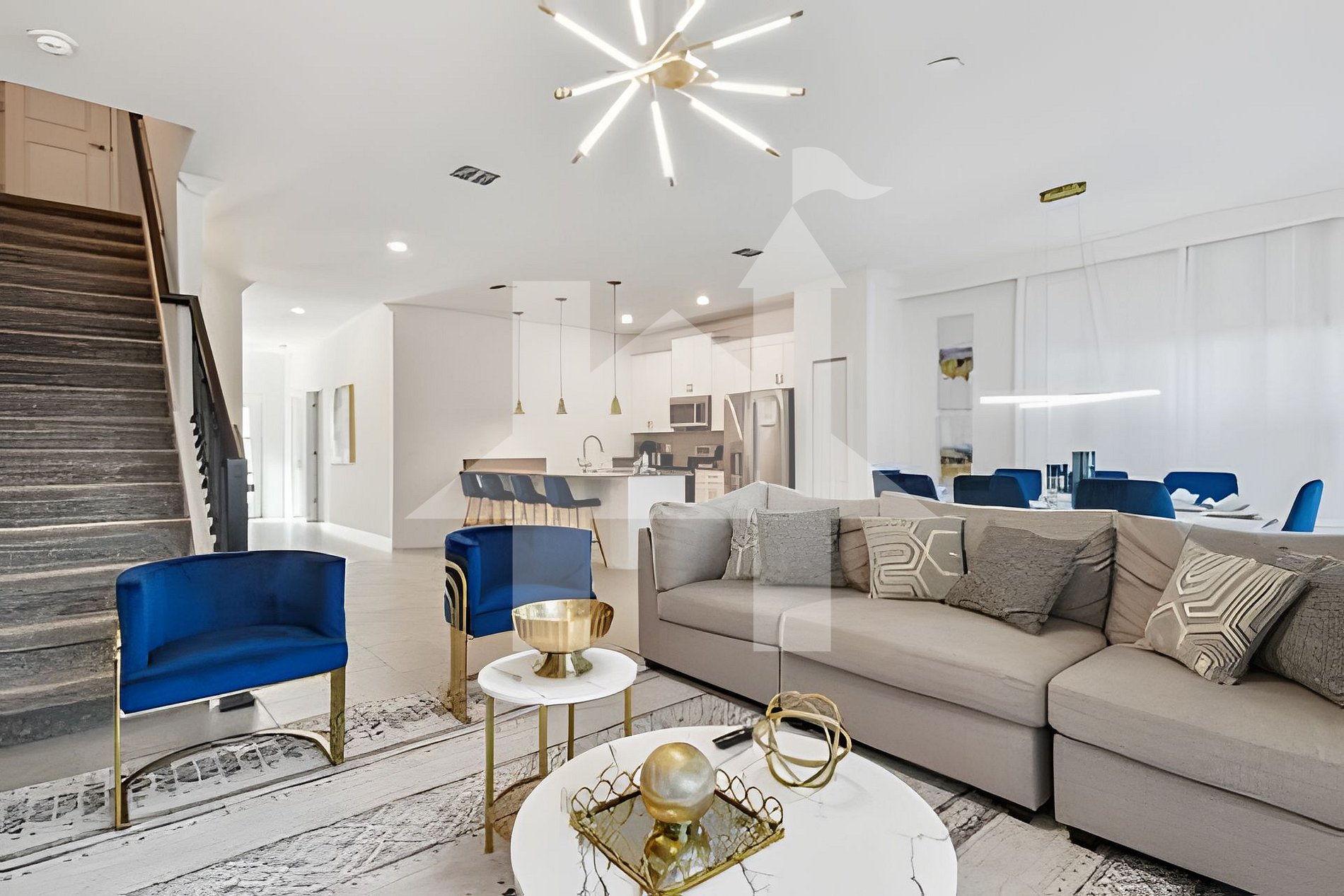 Property Details Enjoy comfort and sophistication in this 5-bedroom, 4-bathroom townhome at Storey Lake—ideal for families or large groups (up to 12 guests). The spacious living room with a sofa for 5 and a 65″ TV invites you to relax. It connects to the fully equipped kitchen, dining table for 8, and breakfast bar with 4 additional seats.