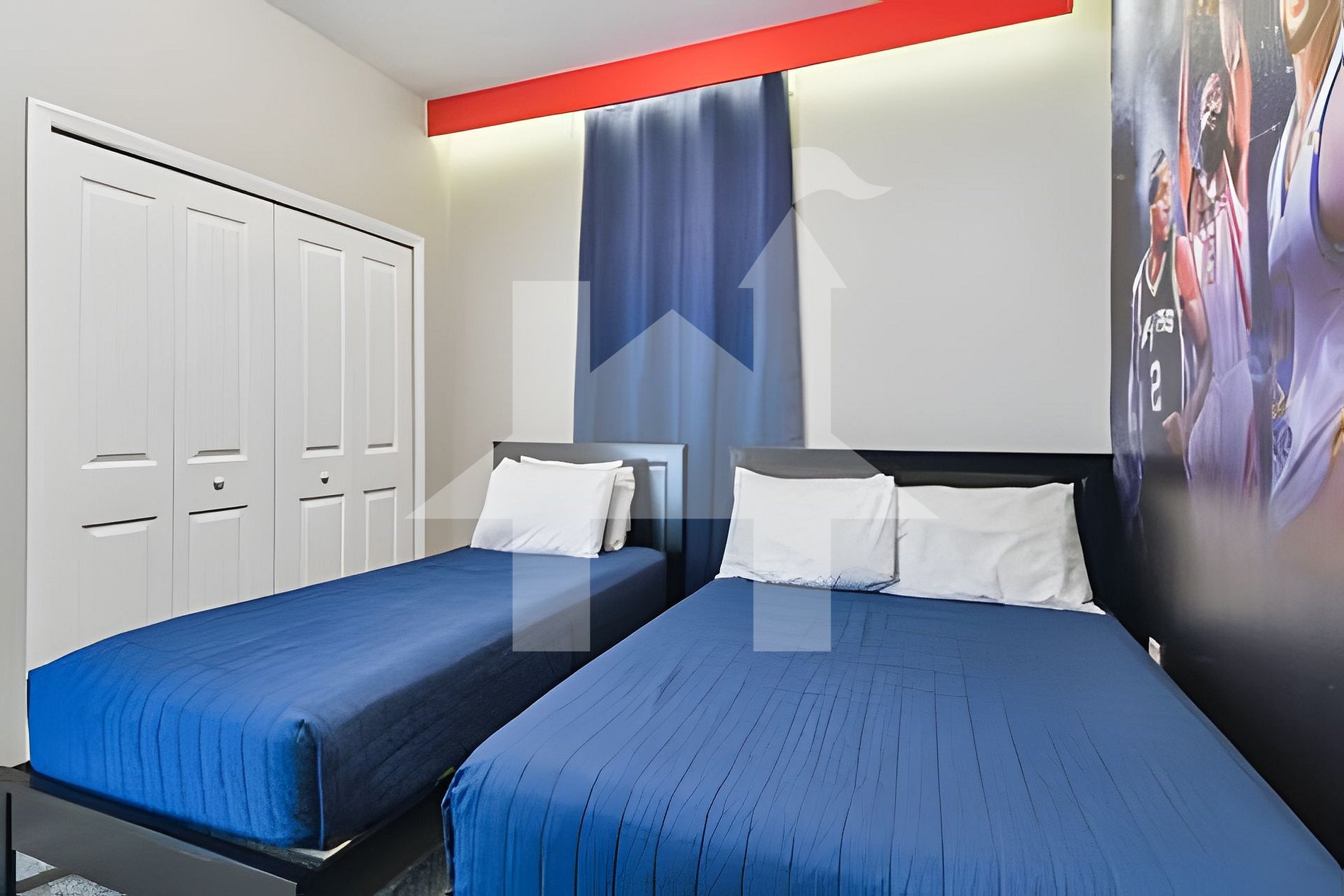 Bedroom with queen bed and TV, sharing a full bathroom “NBA” bedroom with twin + full bed, arcade, and TV