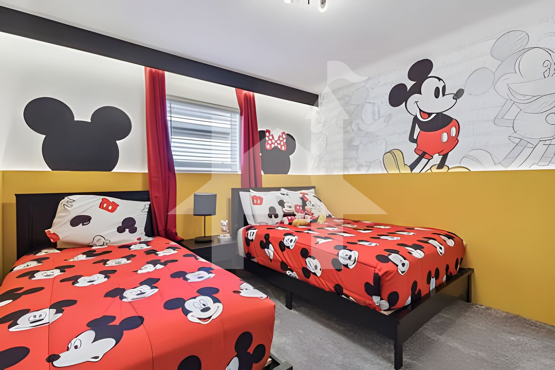 Master Suite 1: king bed, TV, and private bathroom with shower Master Suite 2: king bed, TV, and private bathroom with shower Mickey-themed room: twin + full bed, TV, sharing a bathroom
