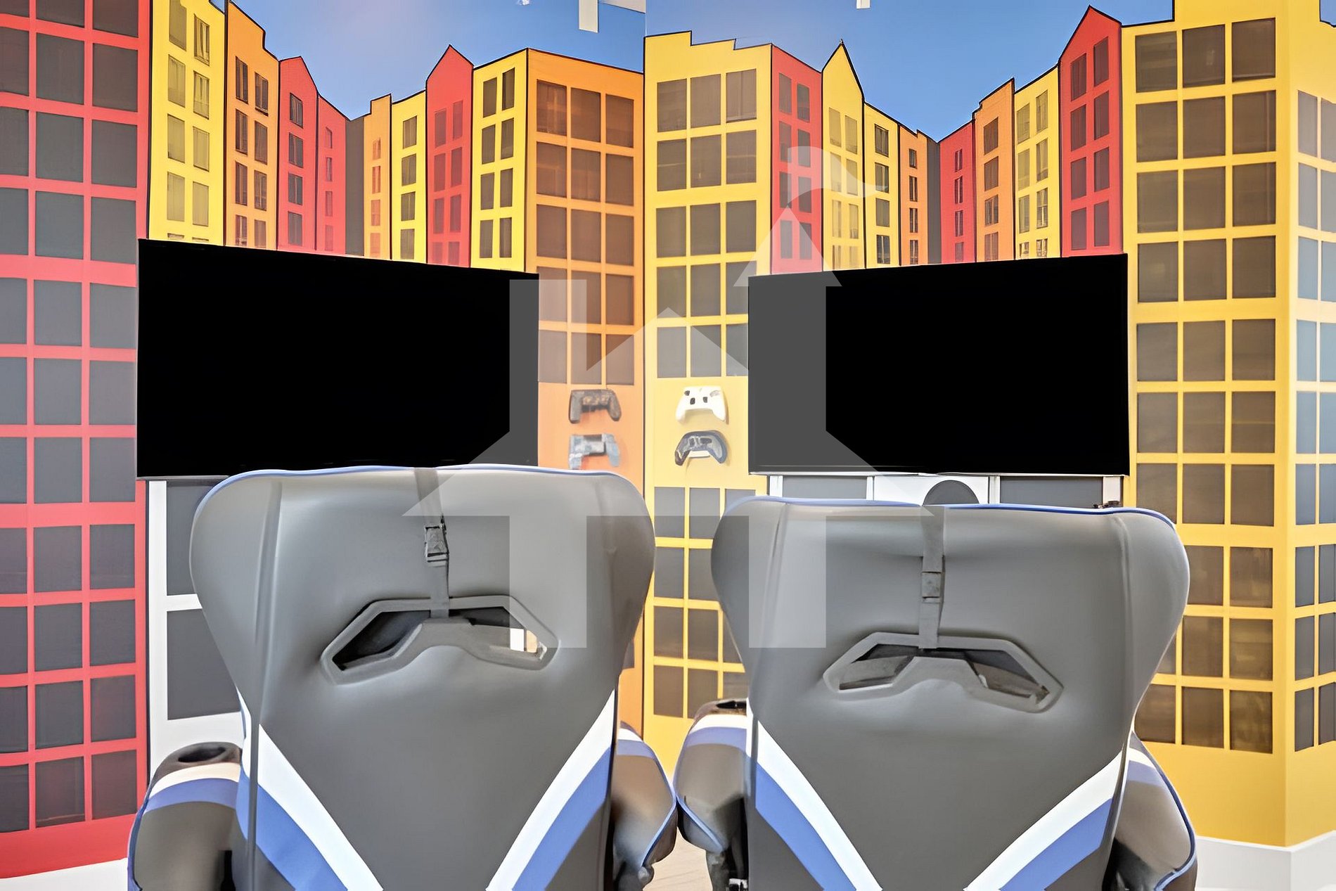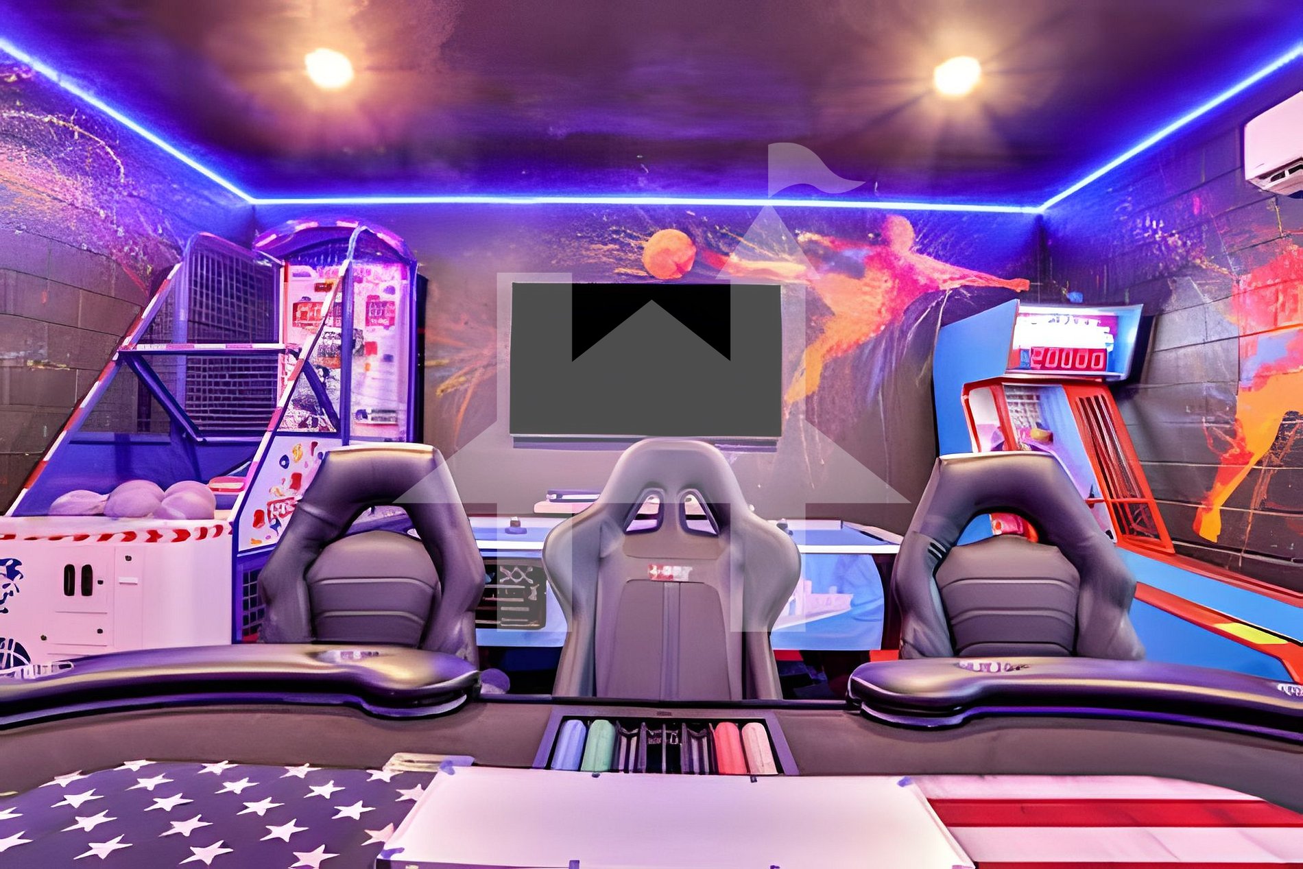 The air-conditioned game room brings together fun and comfort with Skee-Ball, Air Hockey, Sonic Basketball, Pool Table, Poker & Blackjack setup, massage chairs, and an 82” Smart TV. Upstairs, the loft arcade continues the excitement with racing simulators and classic arcade consoles.