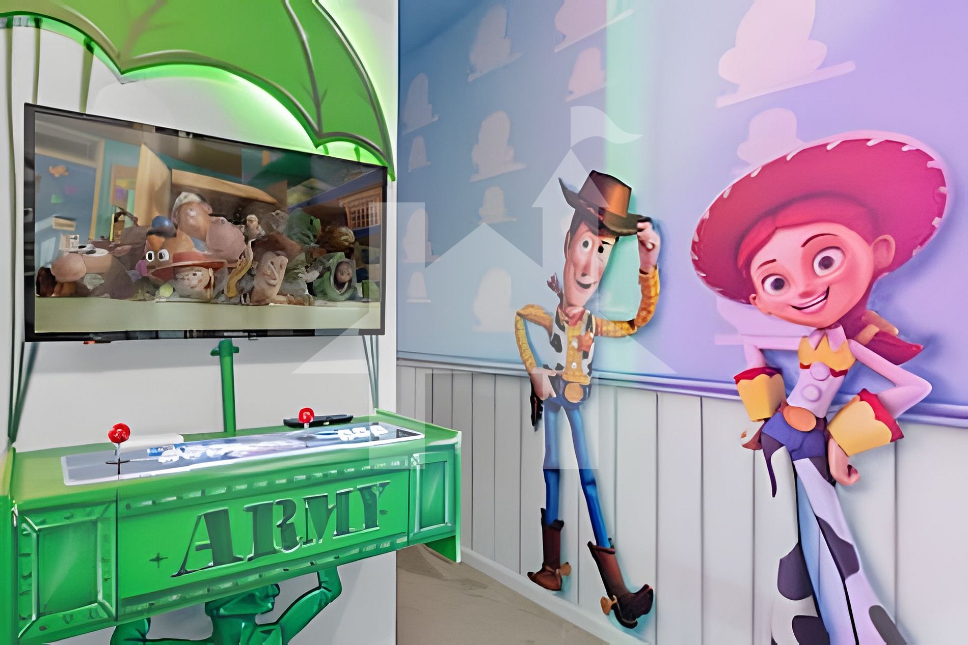 Enjoy a private screened pool and jacuzzi, elegant living areas, and a fully equipped kitchen designed for shared meals and special memories. The themed bedrooms celebrate beloved stories — Mickey, Minions, Toy Story, Mario, and Encanto — while the upper loft transforms into a Harry Potter movie theater with reclining chairs and an 85" smart TV.