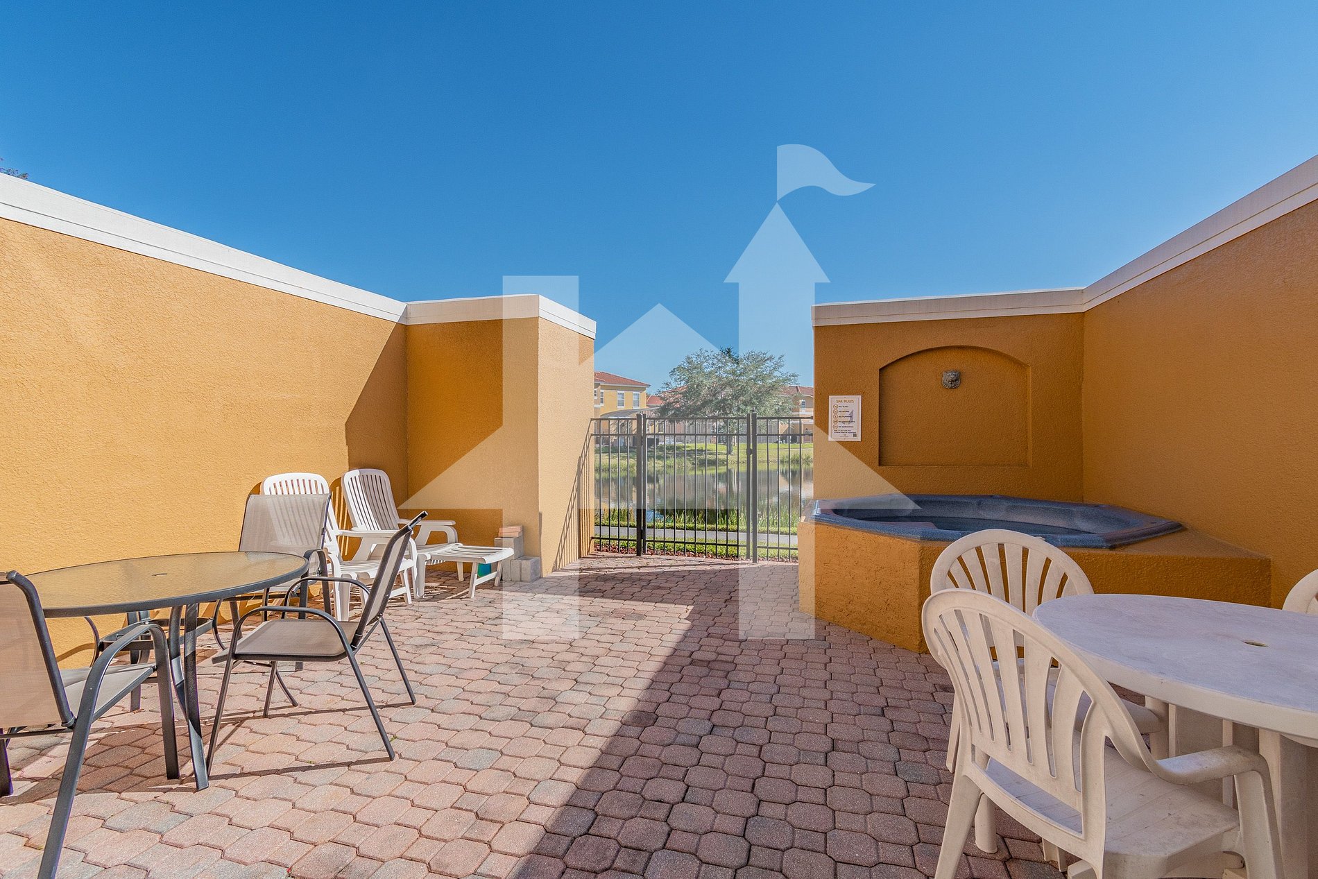 With a 3-seat sofa and loveseat to relax and enjoy, this area opens to the jacuzzi area, which has a table for 6 people. There is also a half bathroom on the first floor.