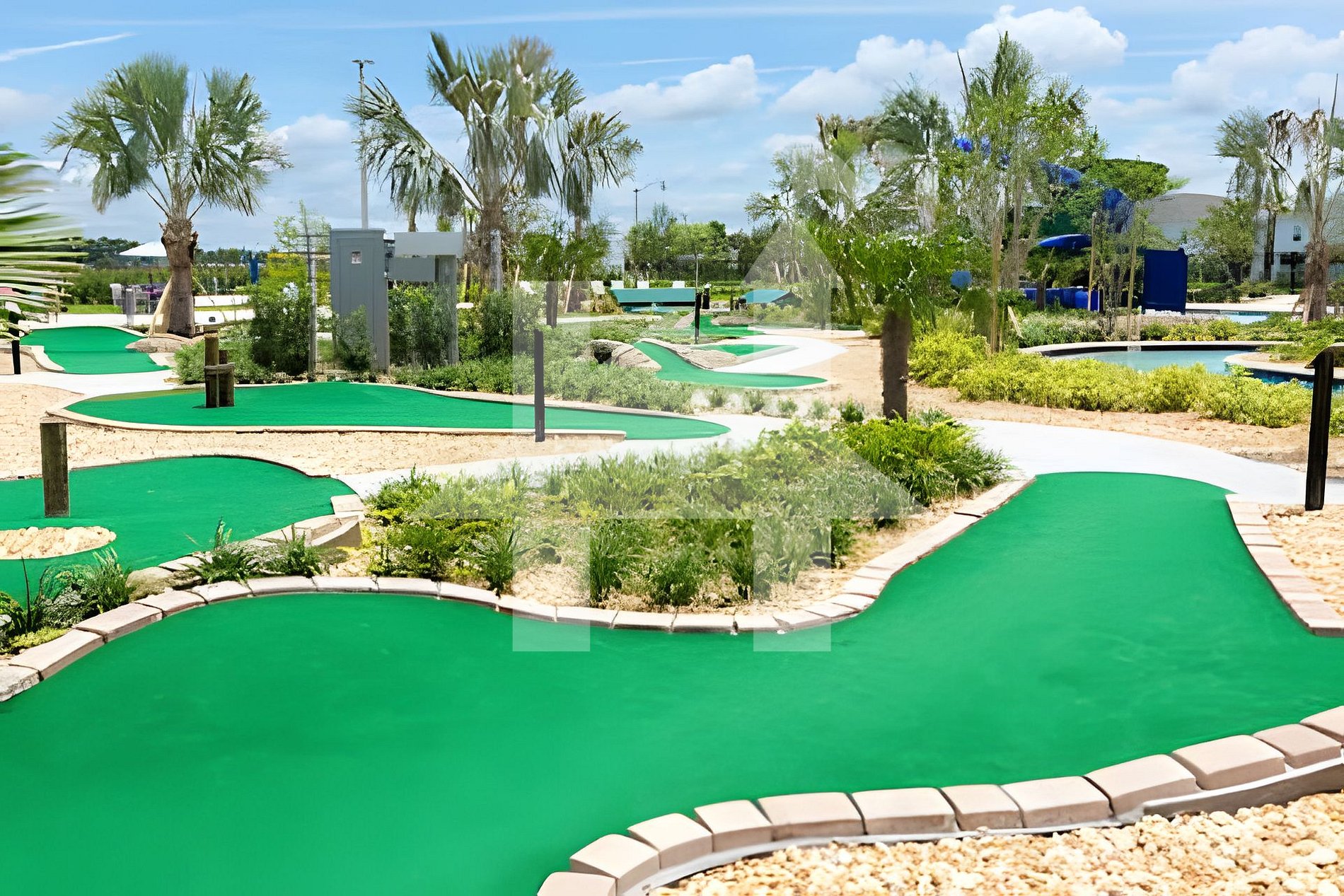 Resort amenities include two clubhouses, lazy river, water slides, splash pad, fitness center, mini golf, playgrounds, and on-resort shuttle