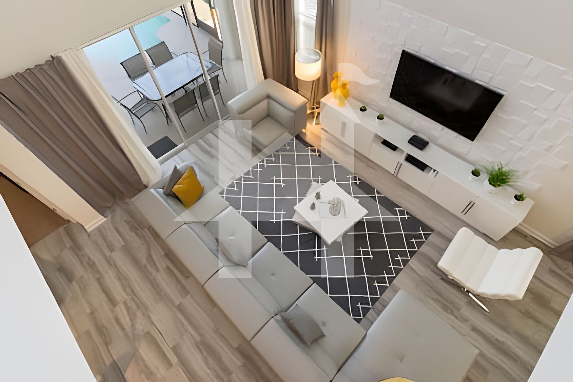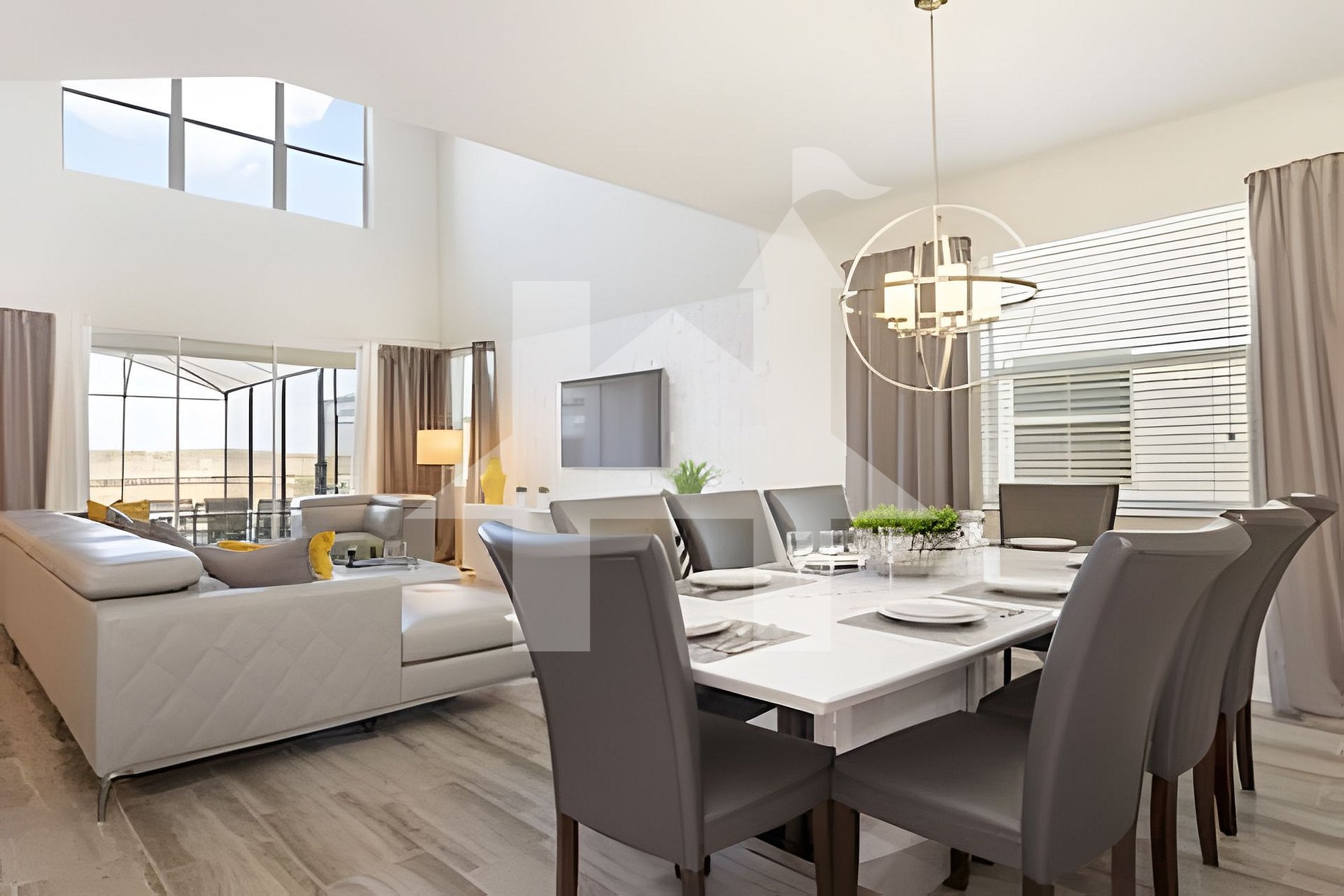 Common Areas: The spacious living room features cozy sofas and stylish accent chairs, with a view of the private pool through sliding glass doors. Outside, there’s a dining area perfect for meals by the pool.