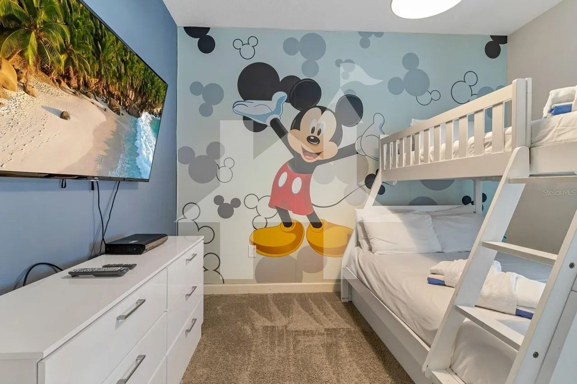 Ground floor: 1 queen bedroom + Mickey-themed room (bunk with trundle, sleeps 4)