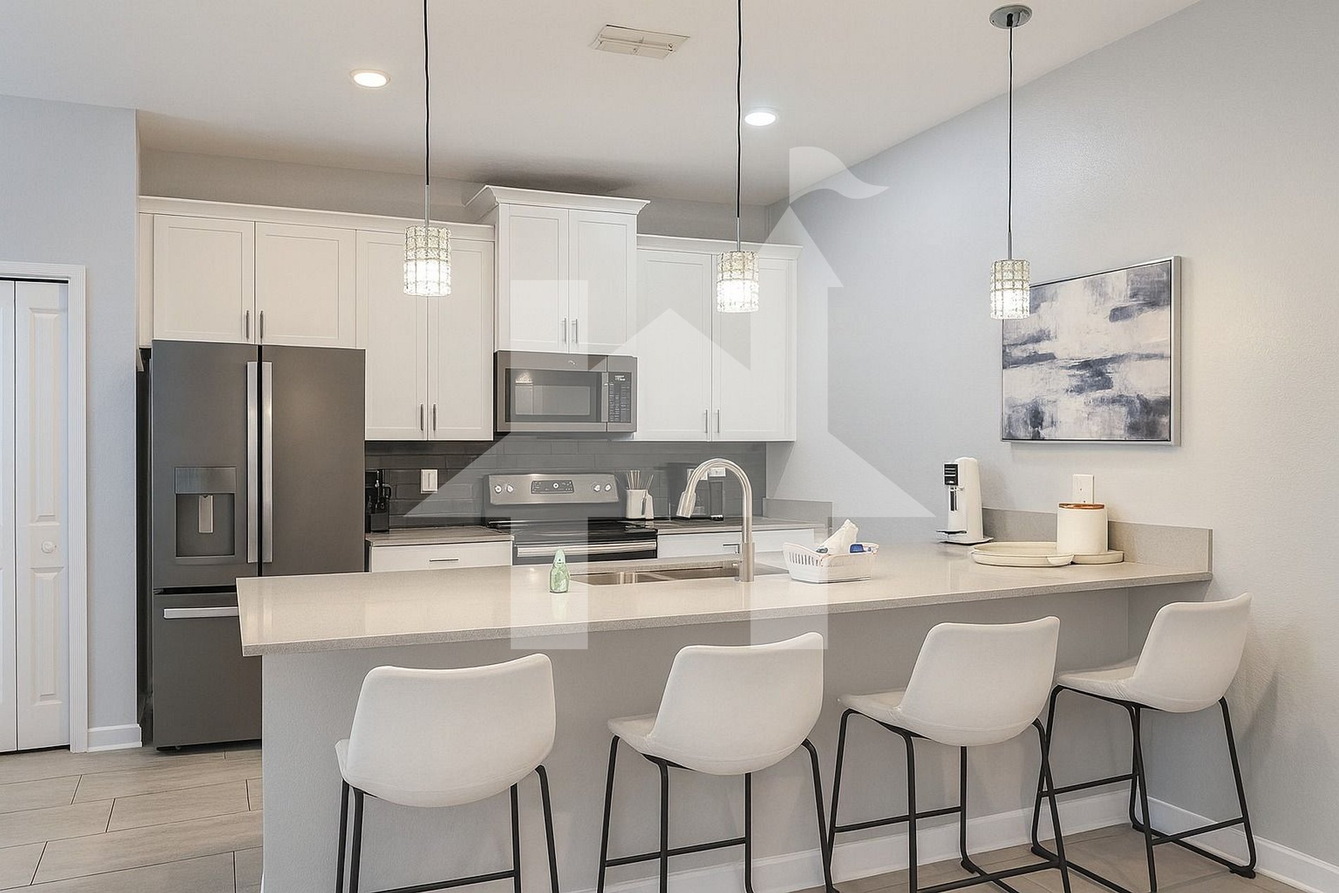 Modern 5BR/4BA home at Storey Lake Resort, sleeps up to 13 guests. Less than 20 minutes from Disney, this spacious retreat features 2 master suites, themed bedrooms, private pool, fully equipped kitchen, dining for 12, fast WiFi, and washer/dryer.