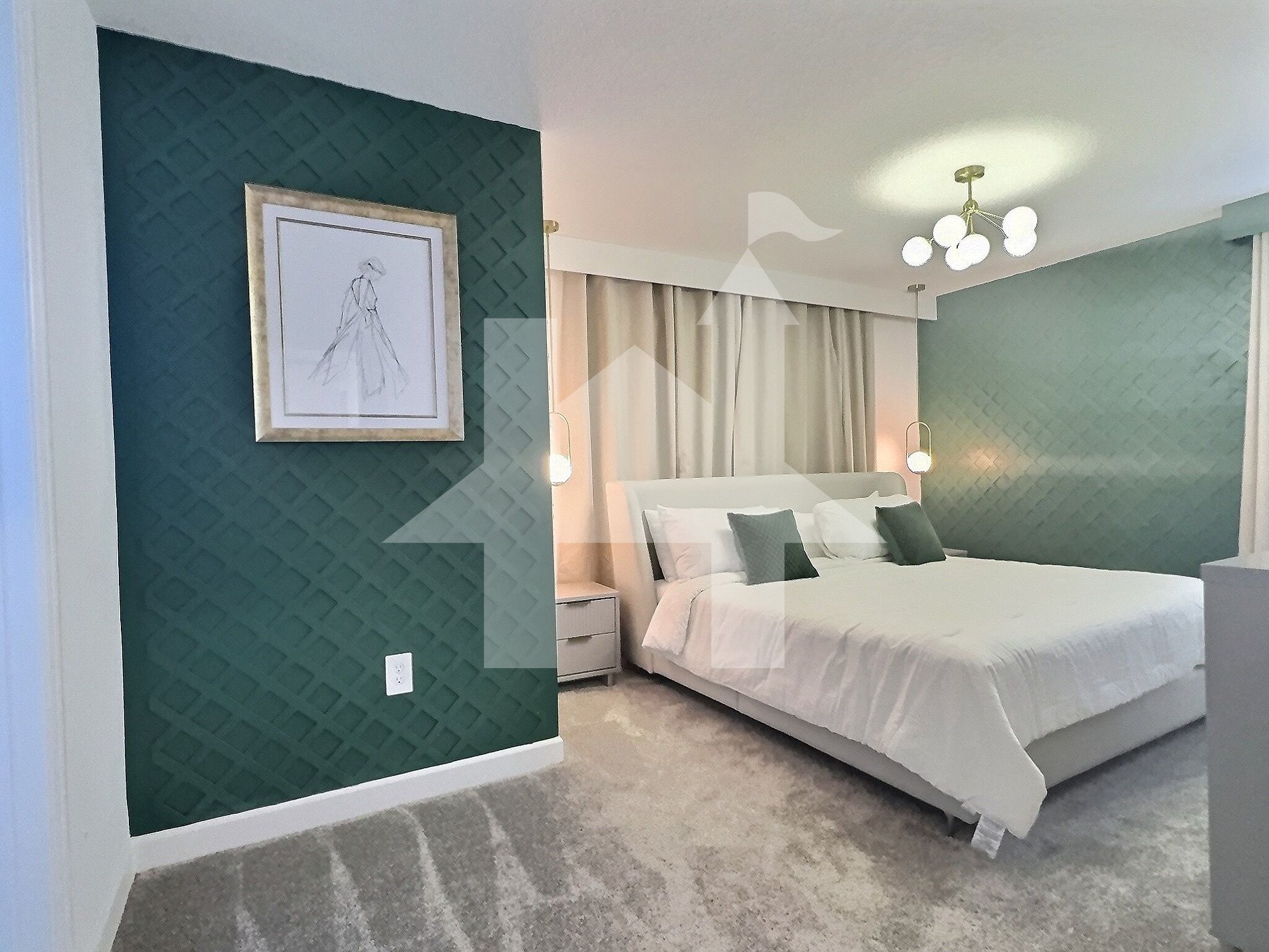 Relax in the elegant living room with a large smart TV, perfect for movie nights. Step outside to the private pool deck, where you'll find lounge chairs and a dining table for outdoor meals. The pool can be heated for year-round fun!