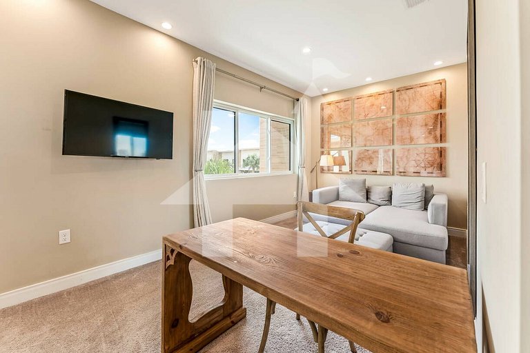 New condominium with modern architecture houses, Magic Village Vews (7594 Bk dr), double-height living rooms, contemporary furniture, and parking spaces in front of the unit. Well-located near US-192 and leisure, such as cinemas, restaurants, waterparks, shopping centers, 06 m8nutes from Disney parks, 03 minutes pharmacies, and Walmart. All of the mentioned, less than 10 minutes from the property.