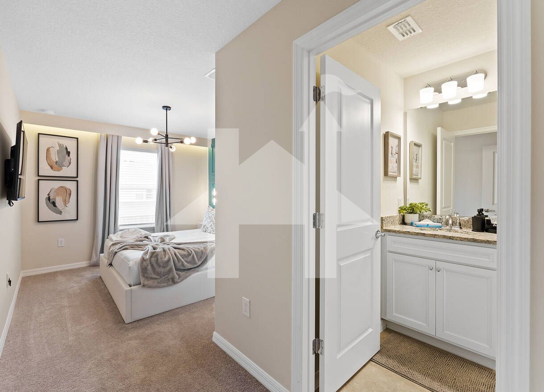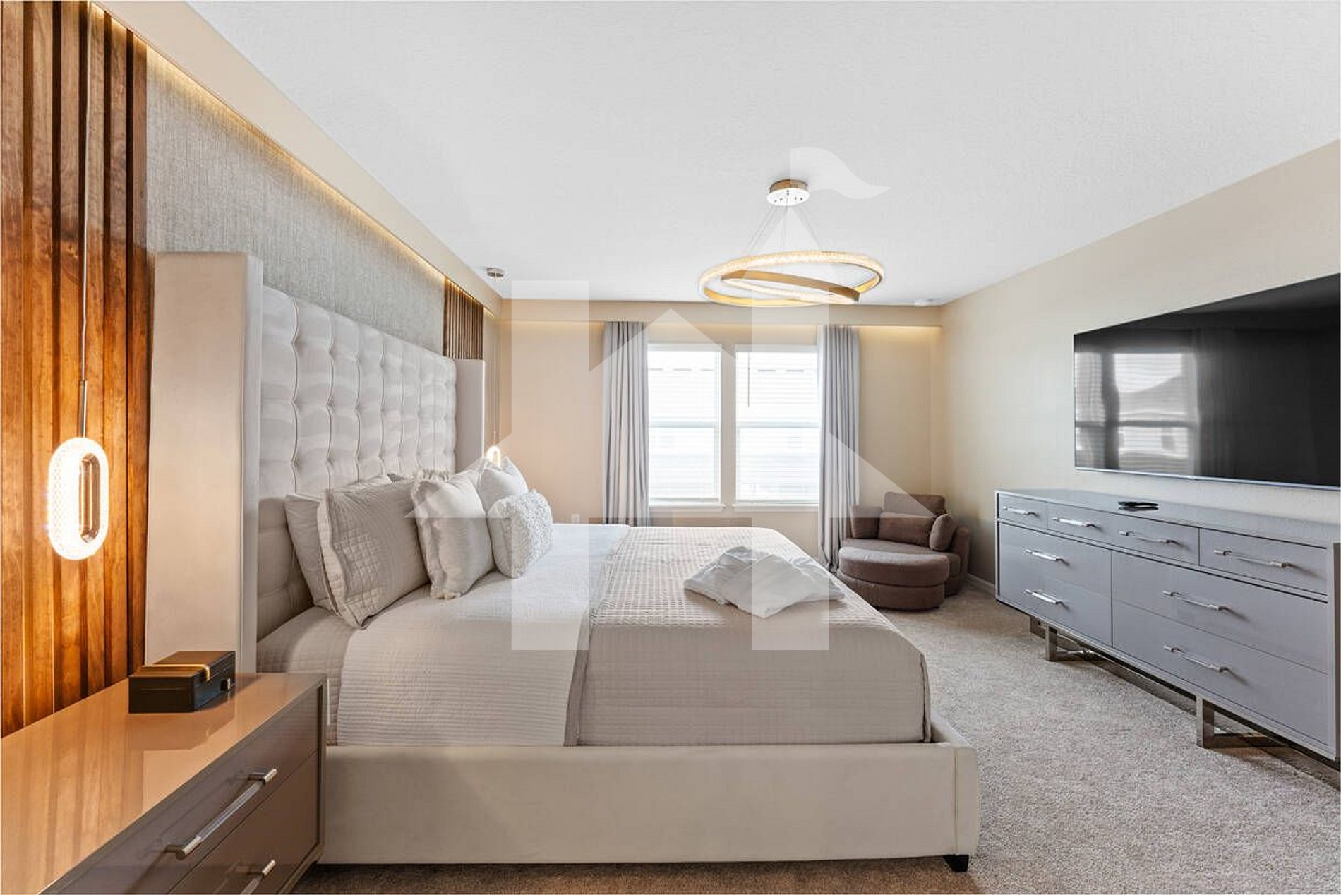 Master suite with king bed, ensuite bathroom, walk‑in closet
