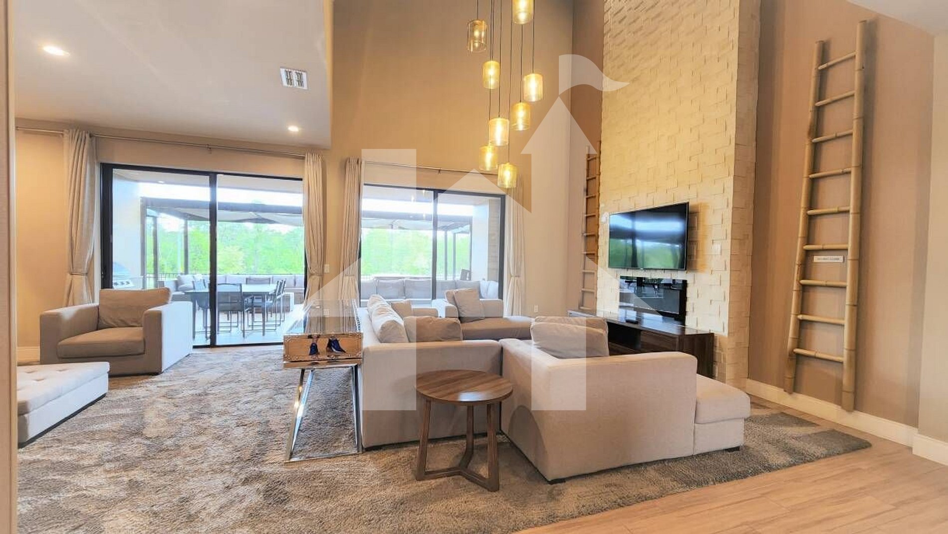 - Living Room: Boasts double-height ceilings, beautiful sofas, chaise lounges, an electric fireplace, and a 55-inch TV, creating a spacious and luxurious ambiance.