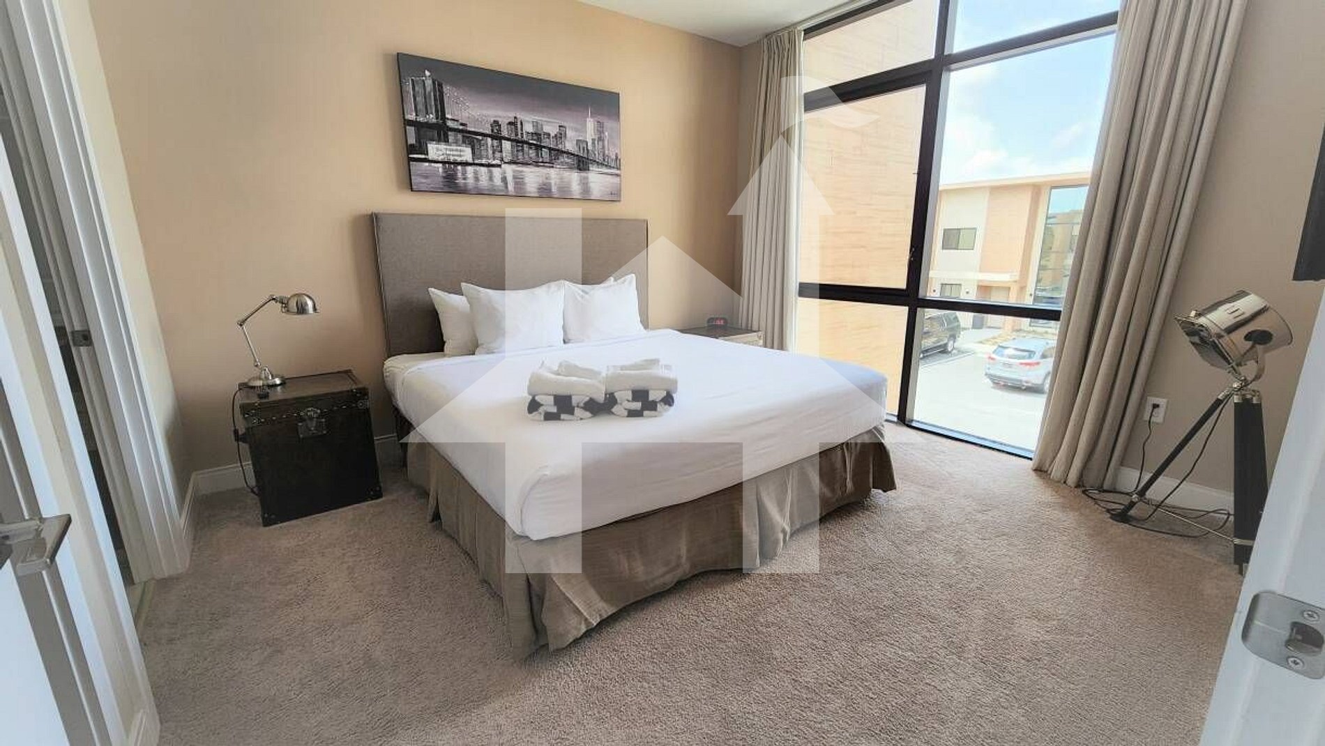 - The master bedroom includes a king bed, a desk, and a huge chaise lounge, offering a blend of comfort and utility.