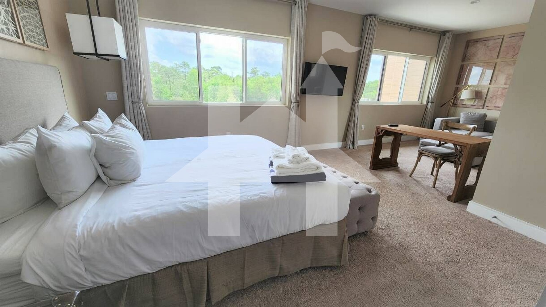 - The master bedroom includes a king bed, a desk, and a huge chaise lounge, offering a blend of comfort and utility.
