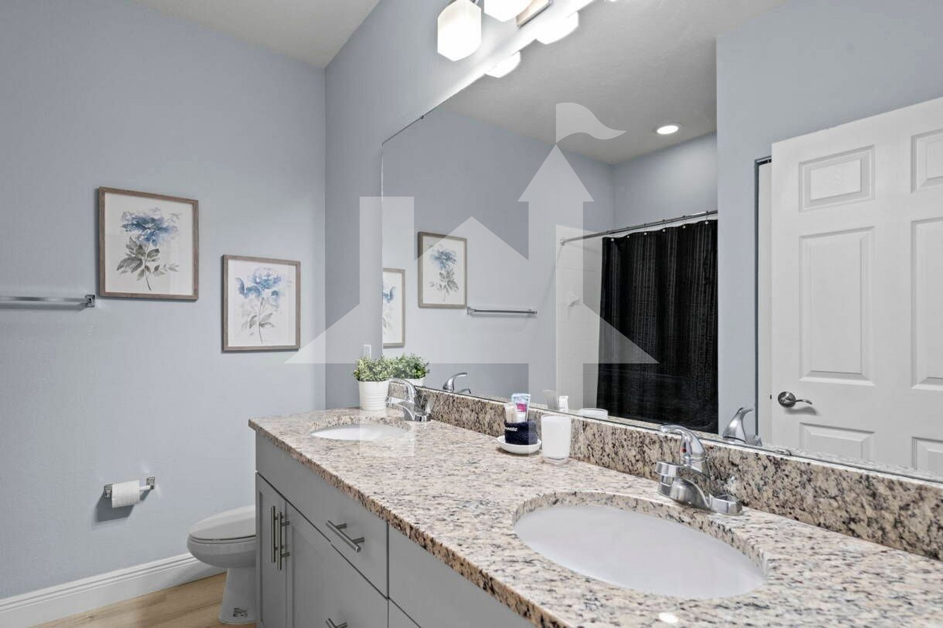 Shared bathroom with double sinks serving both upstairs bedrooms