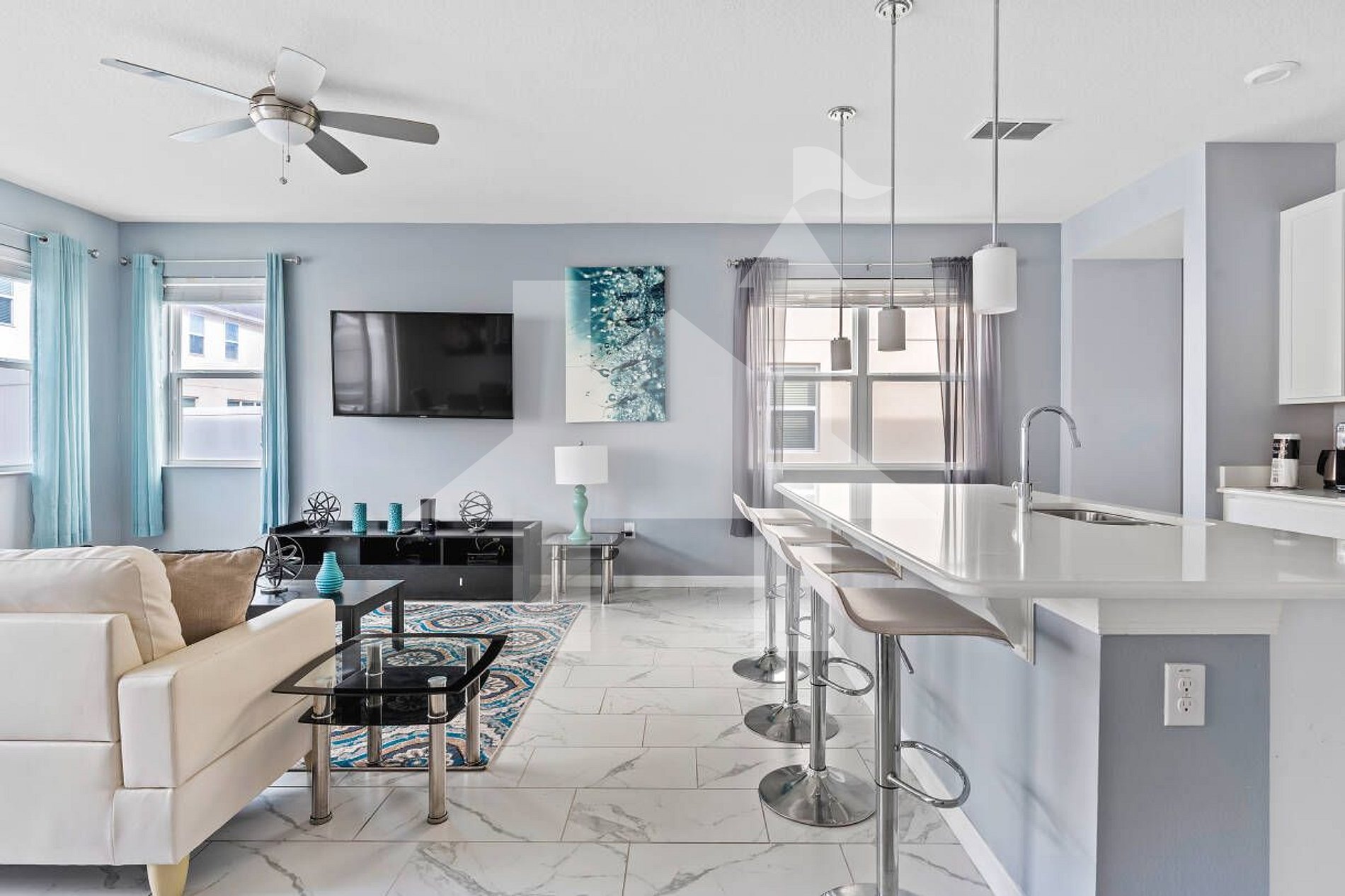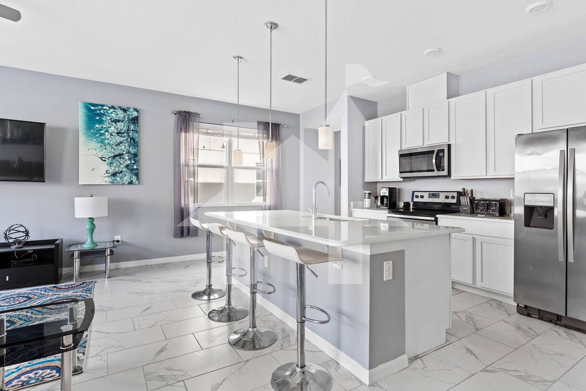 Stay near Disney at this 2017-built 4-bedroom, 3.5-bath townhouse in Compass Bay Resort. Perfect for families, it features a pool, modern kitchen, BBQ patio, and stylish decor. Includes 4 high chairs, laundry, and bathroom amenities. Close to Disney parks!