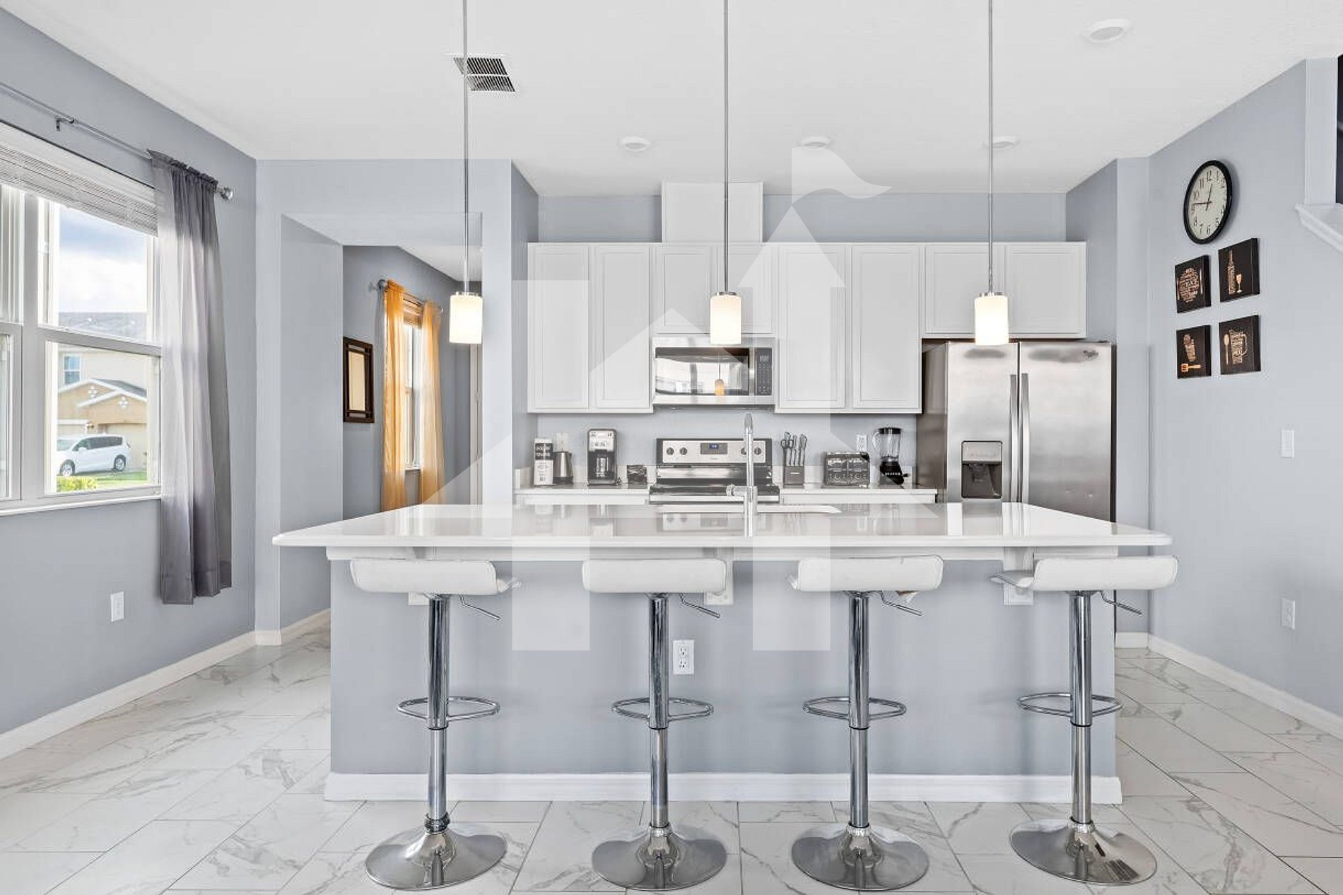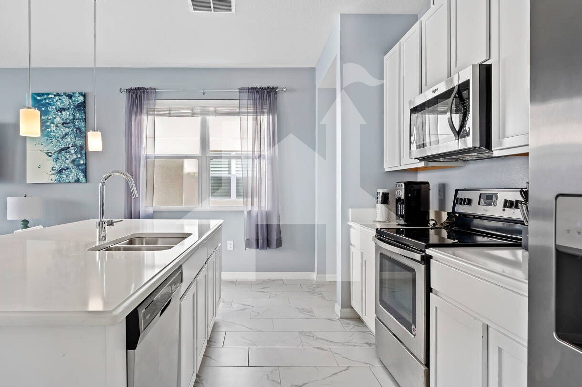 Upon entering the house, you will find a great TV room, dining room, and a modern and complete kitchen with cabinets.