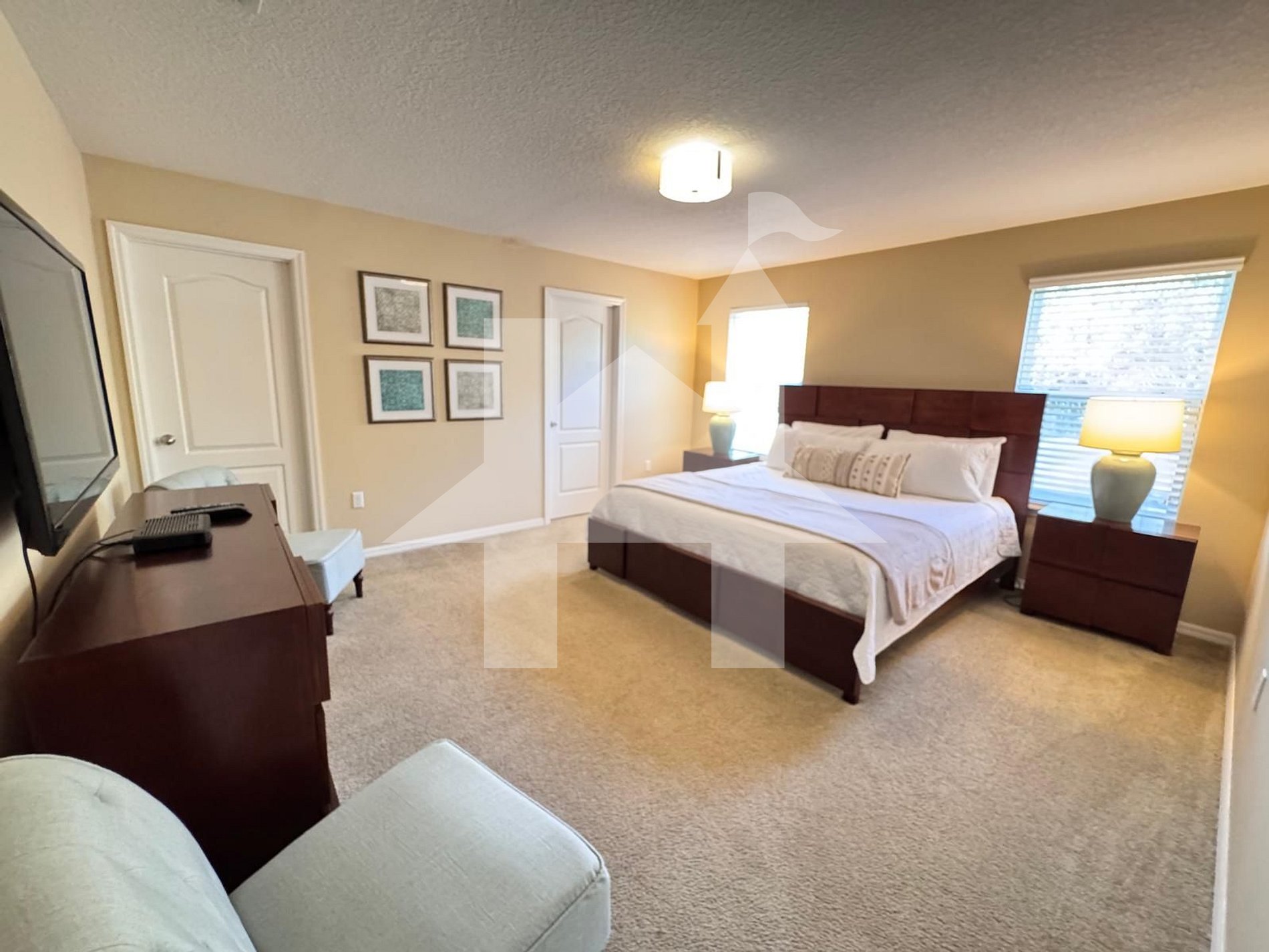 Bedroom #2: (Upstairs) – Master Bed with King Bed and private bathroom ensuite, TV