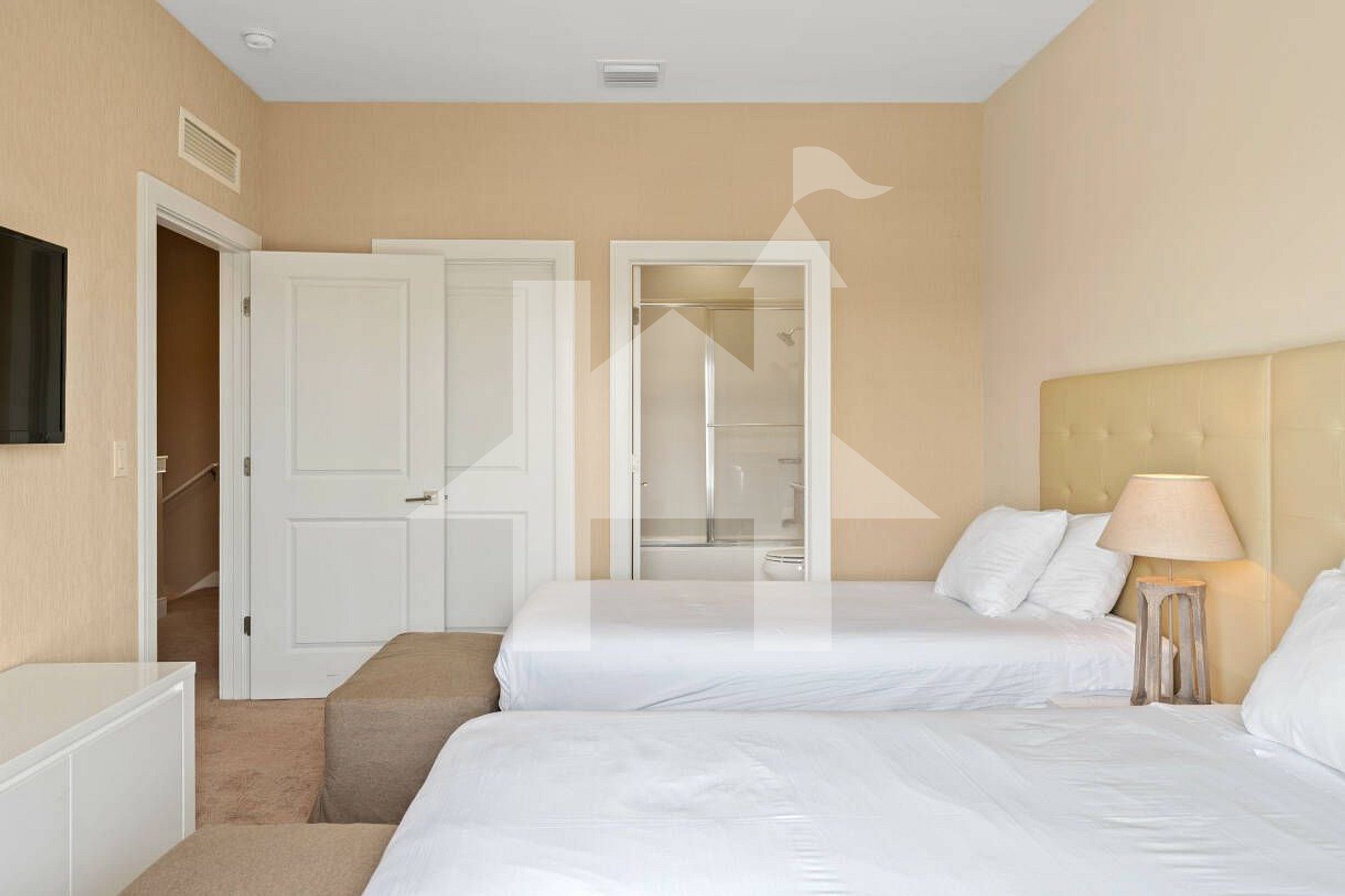 -Third and Fourth Bedrooms: Each with twin beds and private bathrooms. These rooms also feature closets and TVs.