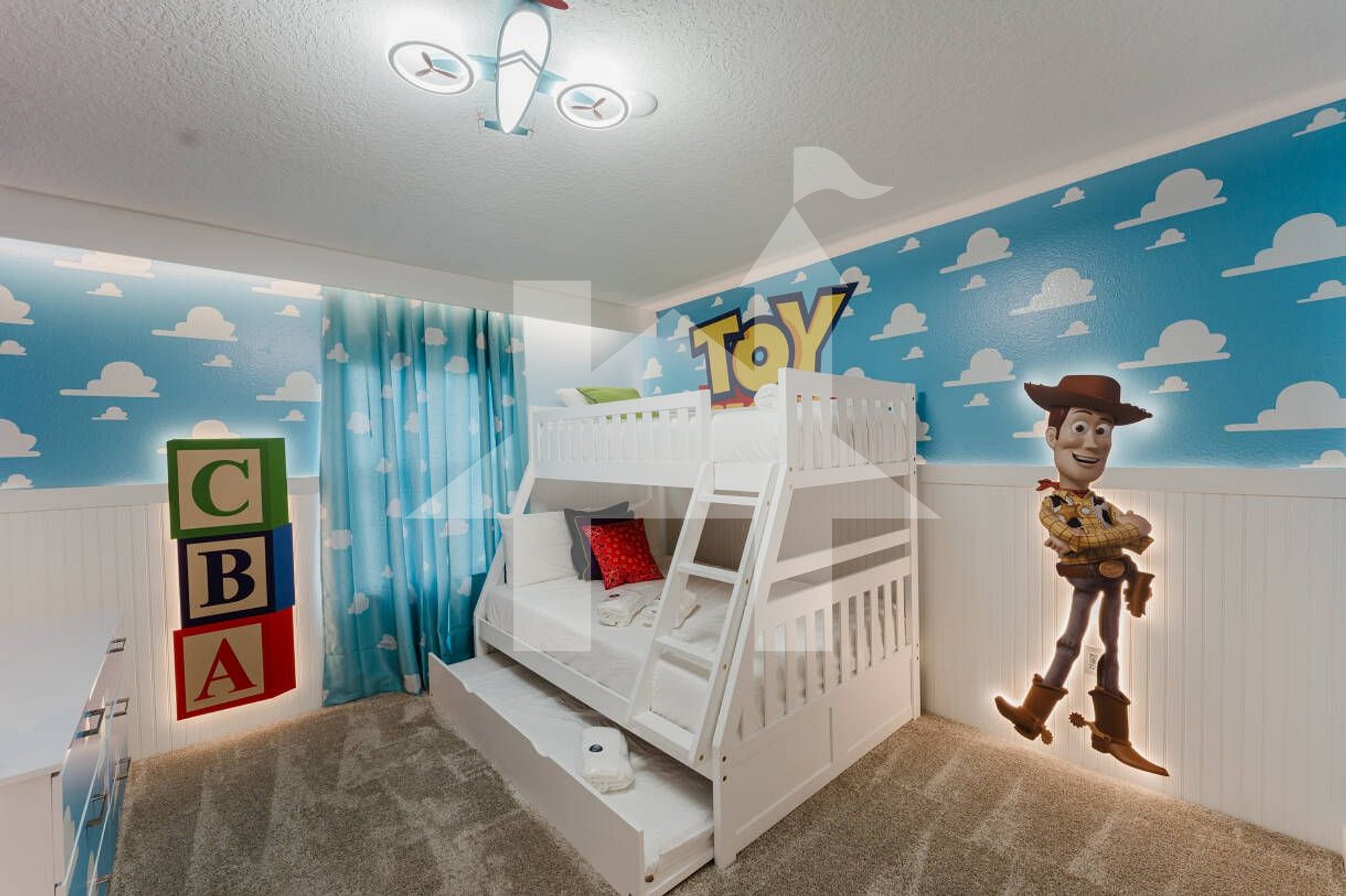 • Toy Story Room: Bunk bed with 1 full and 2 twin beds, Smart TV