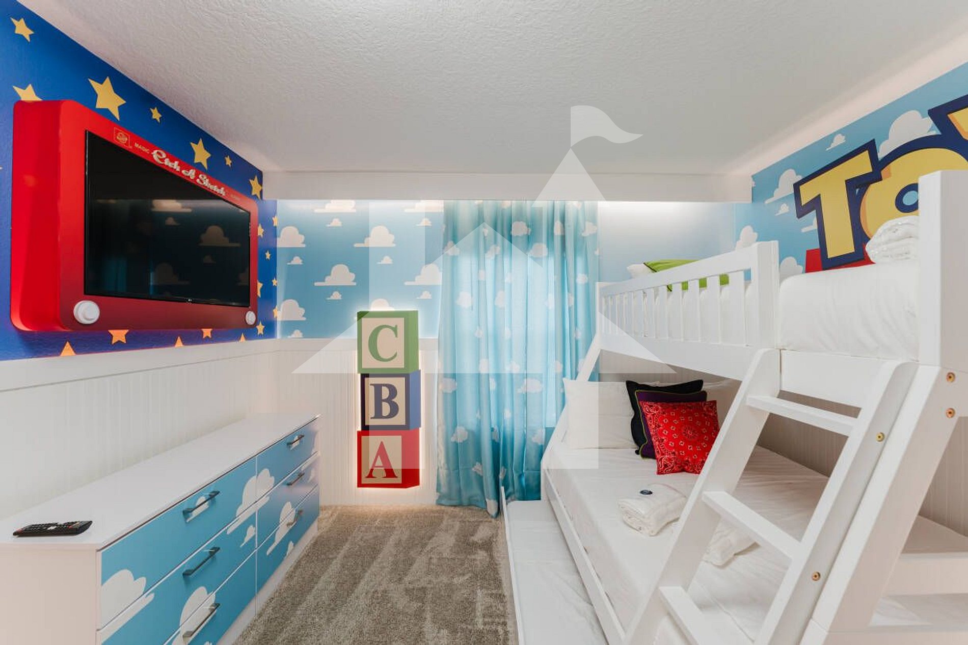 • Toy Story Room: Bunk bed with 1 full and 2 twin beds, Smart TV