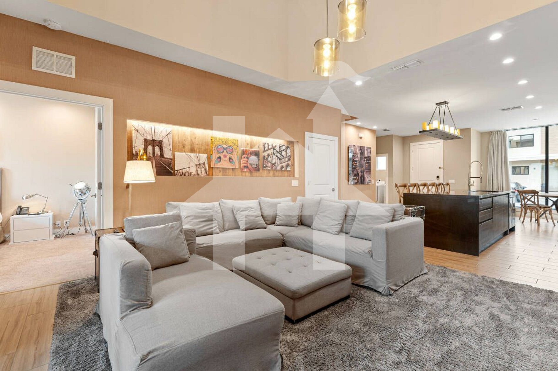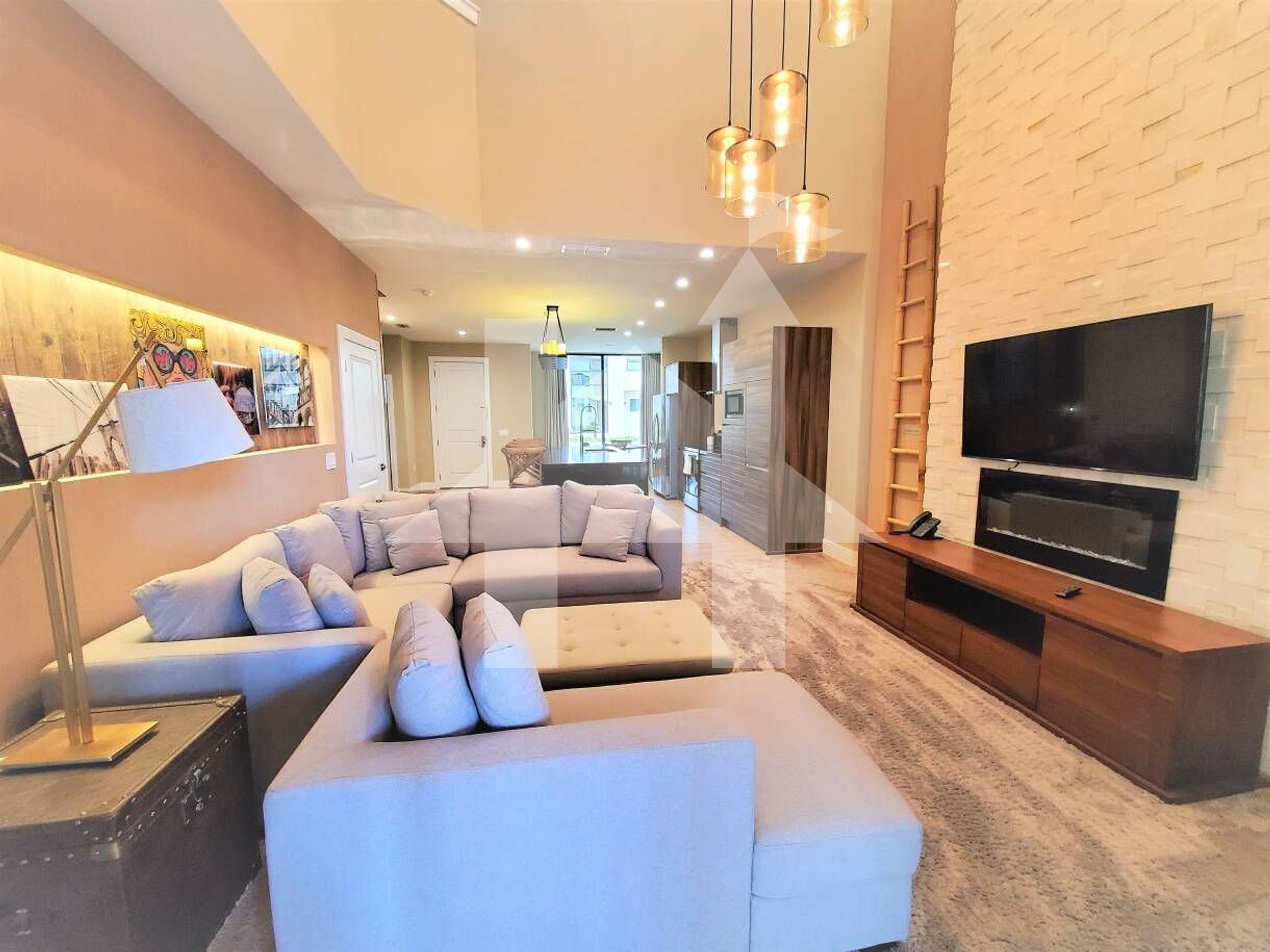 -Living Room: Features a beautiful electric fireplace, double-height ceilings which provide a spacious and luxurious feel, along with a half-bath.