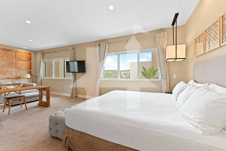 -Master suite: includes a king bed, a work desk, and a large chaise lounge for relaxation.