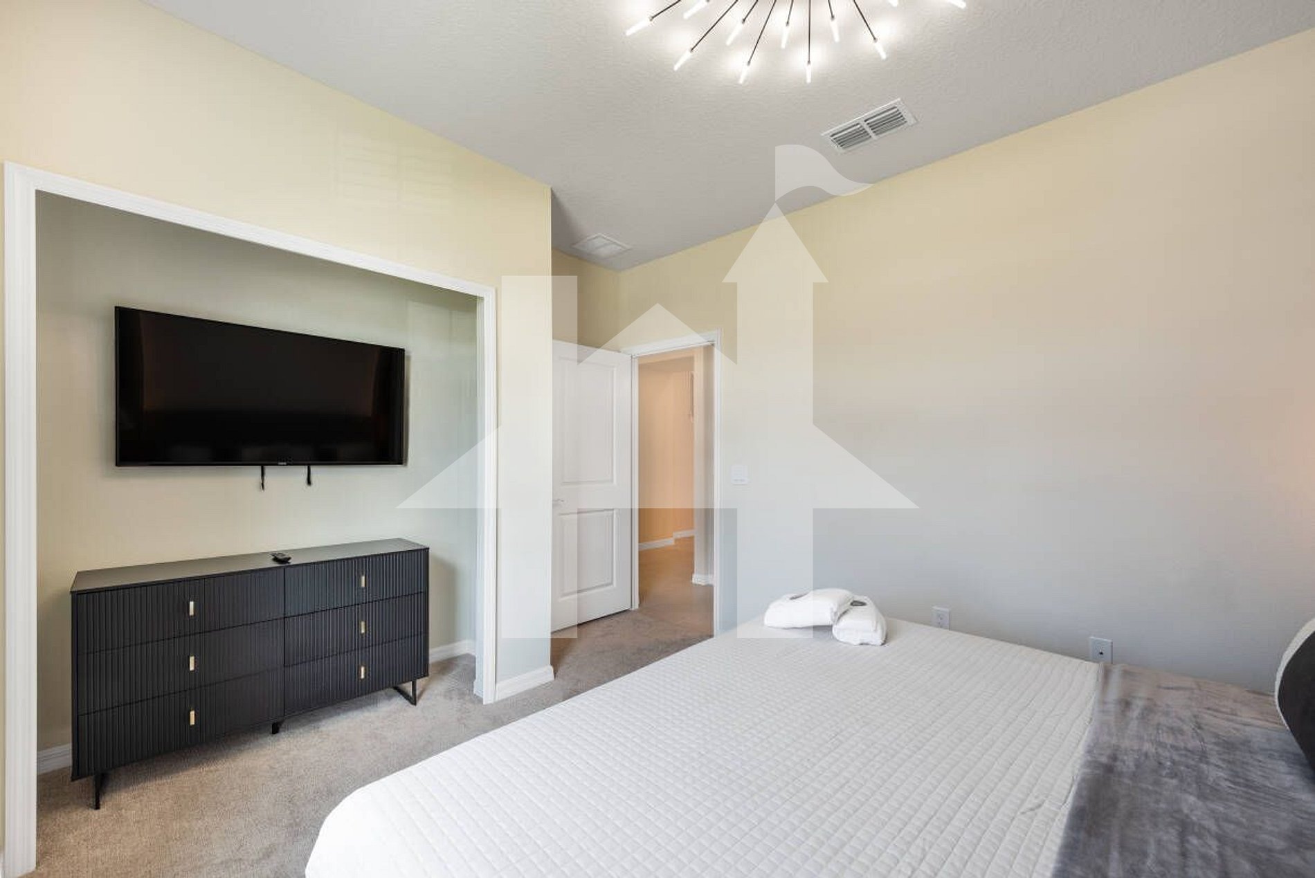 Bedroom: King bed + 55″ TV; shared hallway bathroom