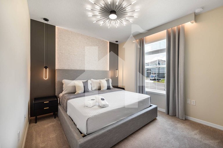 Windsor Island: A newly built, two-story house offering 5 bedrooms and 4.5 bathrooms. It accommodates up to 12 guests, featuring a fully equipped kitchen, spacious living areas, and themed bedrooms. Highlights include a private heated pool, a Mario-themed living area, a king-size master bedroom, and free WiFi. Resort amenities include pools, lazy river, hot tub, playground, fitness gym, and more, in a gated community with 24-hour security.