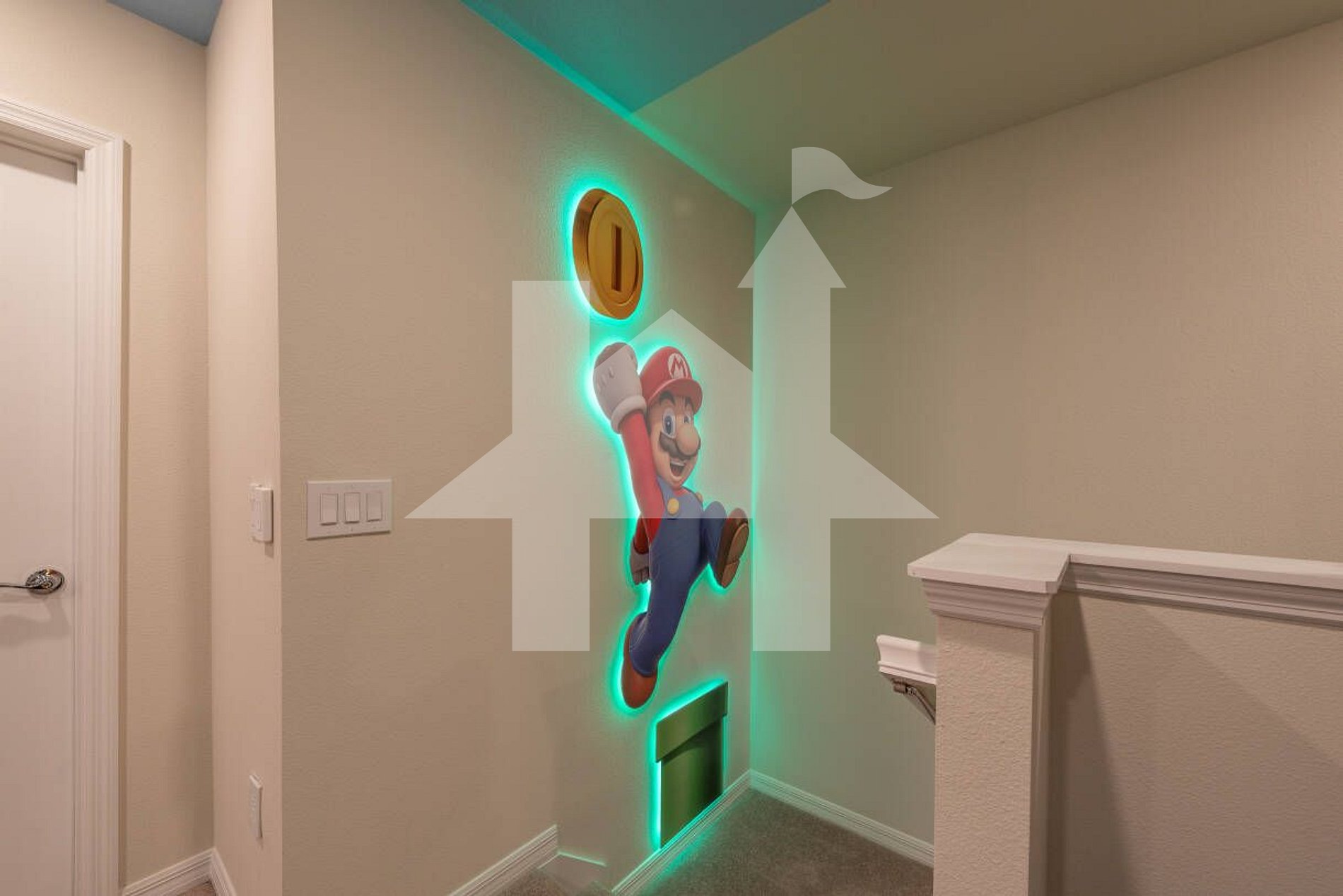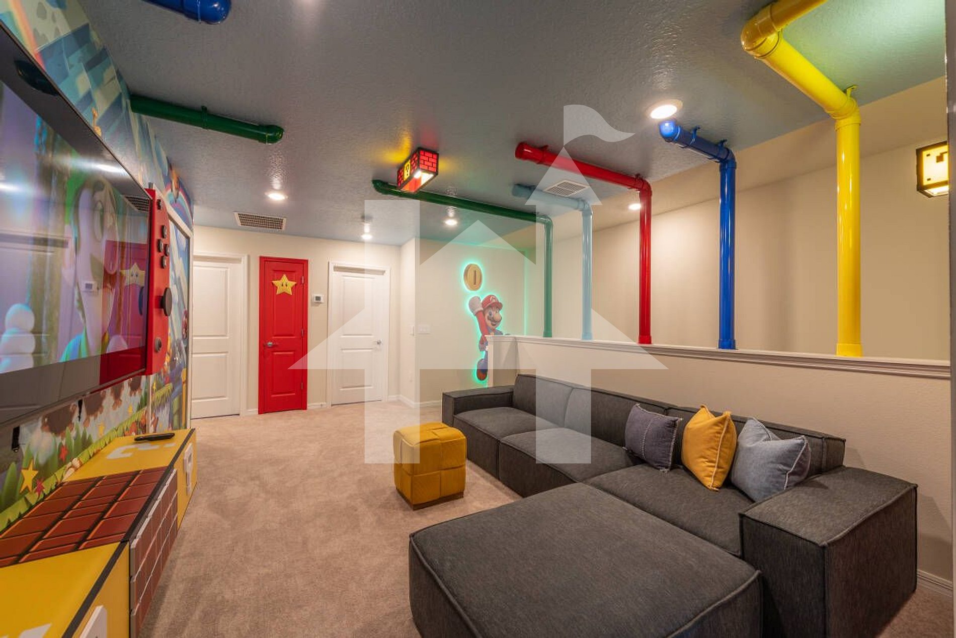 Themed media lounge: Mario‑inspired, 65″ TV, chaise sofa
