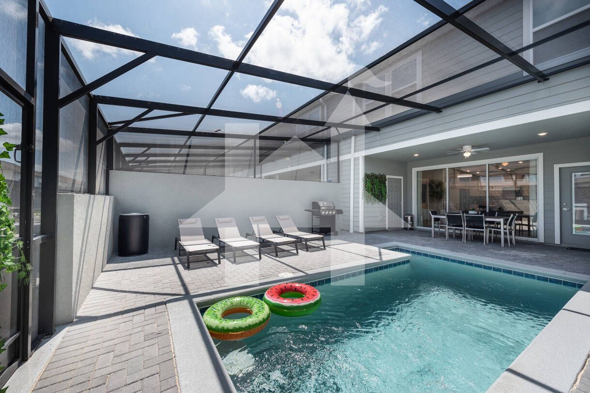 Glass multi‑slide doors open to the covered patio with table for 6, 4 loungers, a BBQ grill (available for an additional $100 fee for cleaning and propane), and a private pool (heating optional)