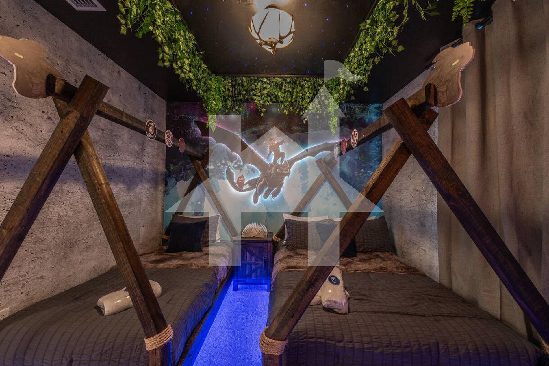 Themed Bedroom 1: Full + twin beds, 43″ TV, “How to Train Your Dragon” theme
