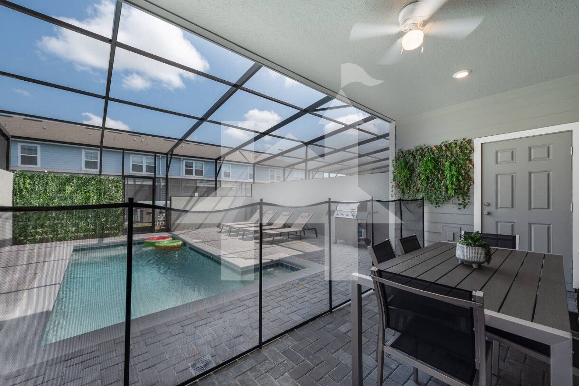Glass multi‑slide doors open to the covered patio with table for 6, 4 loungers, a BBQ grill (available for an additional $100 fee for cleaning and propane), and a private pool (heating optional)
