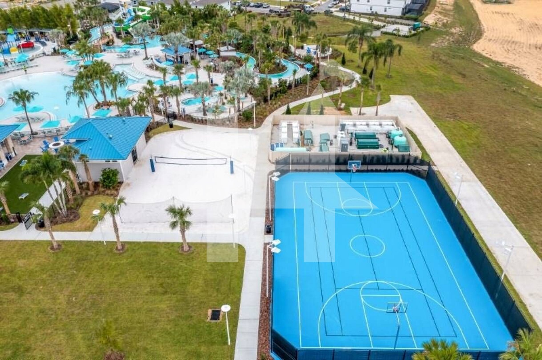 Resort access: pool, lazy river, splash playground, tiki bar, mini golf, sports courts, gym, arcade