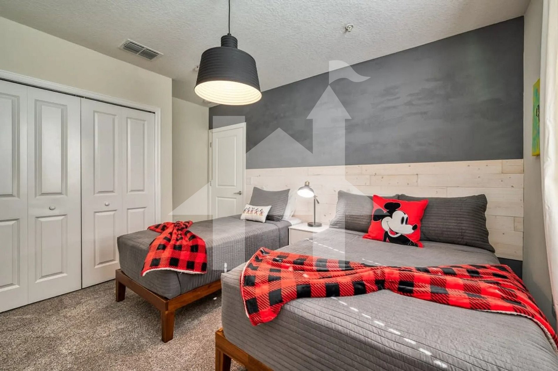 - Mickey-Themed Bedroom: One full bed and one twin bed, Disney décor, and private bathroom access