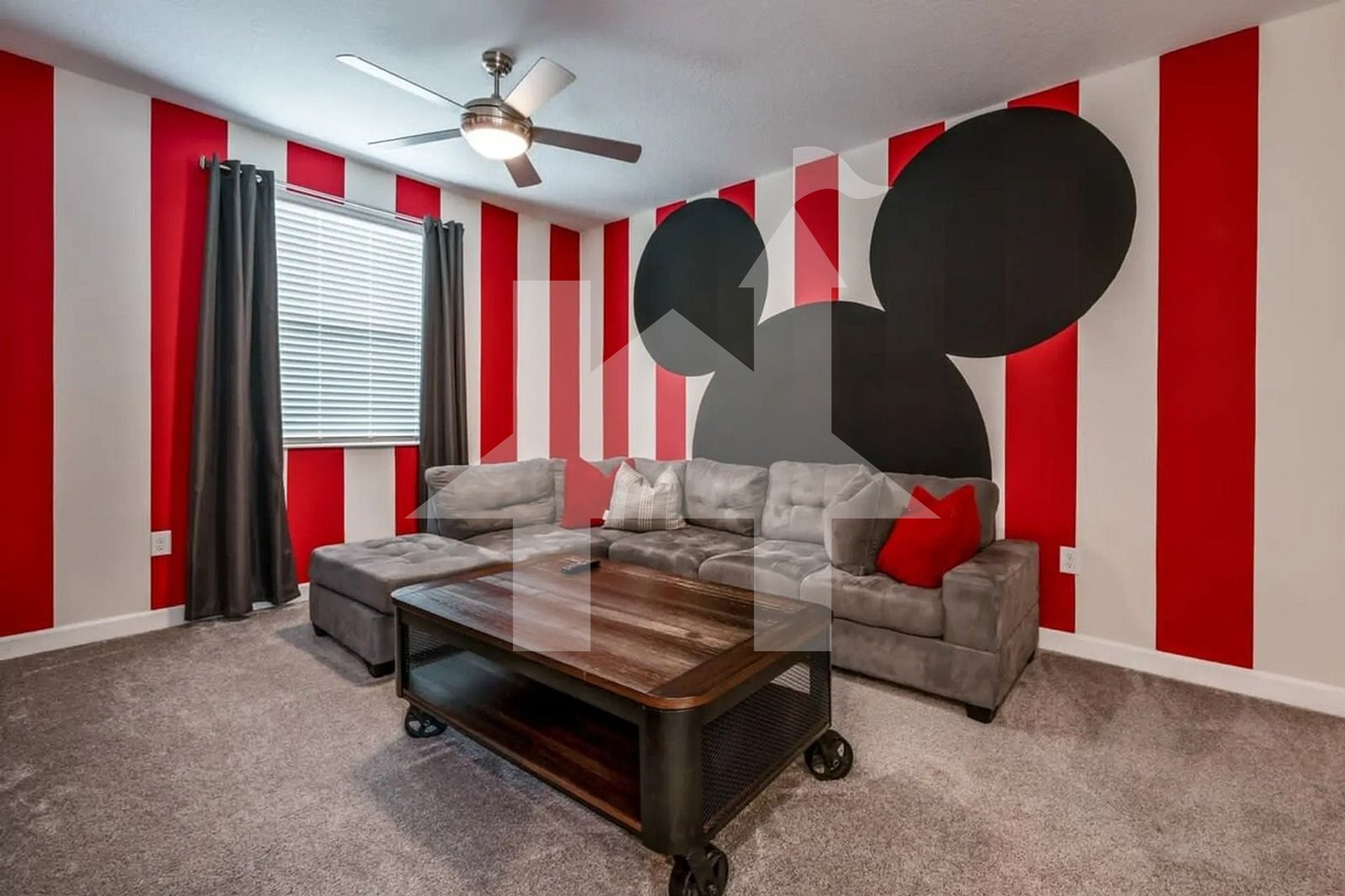 Upstairs, the entertainment continues in a cozy Mickey-themed family room, leading to five uniquely designed bedrooms: