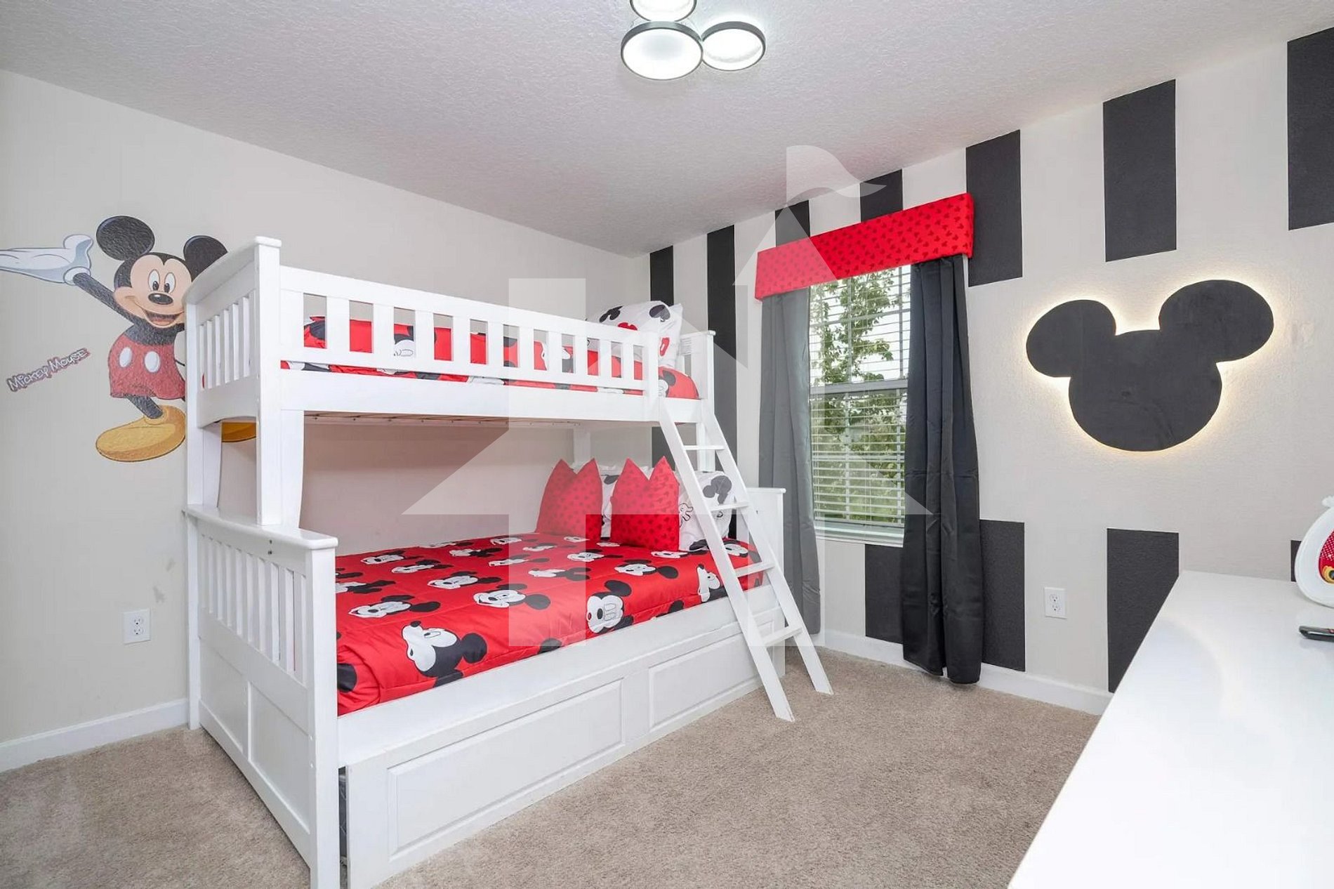 Mickey-themed room: bunk (Full + Twin) + twin trundle