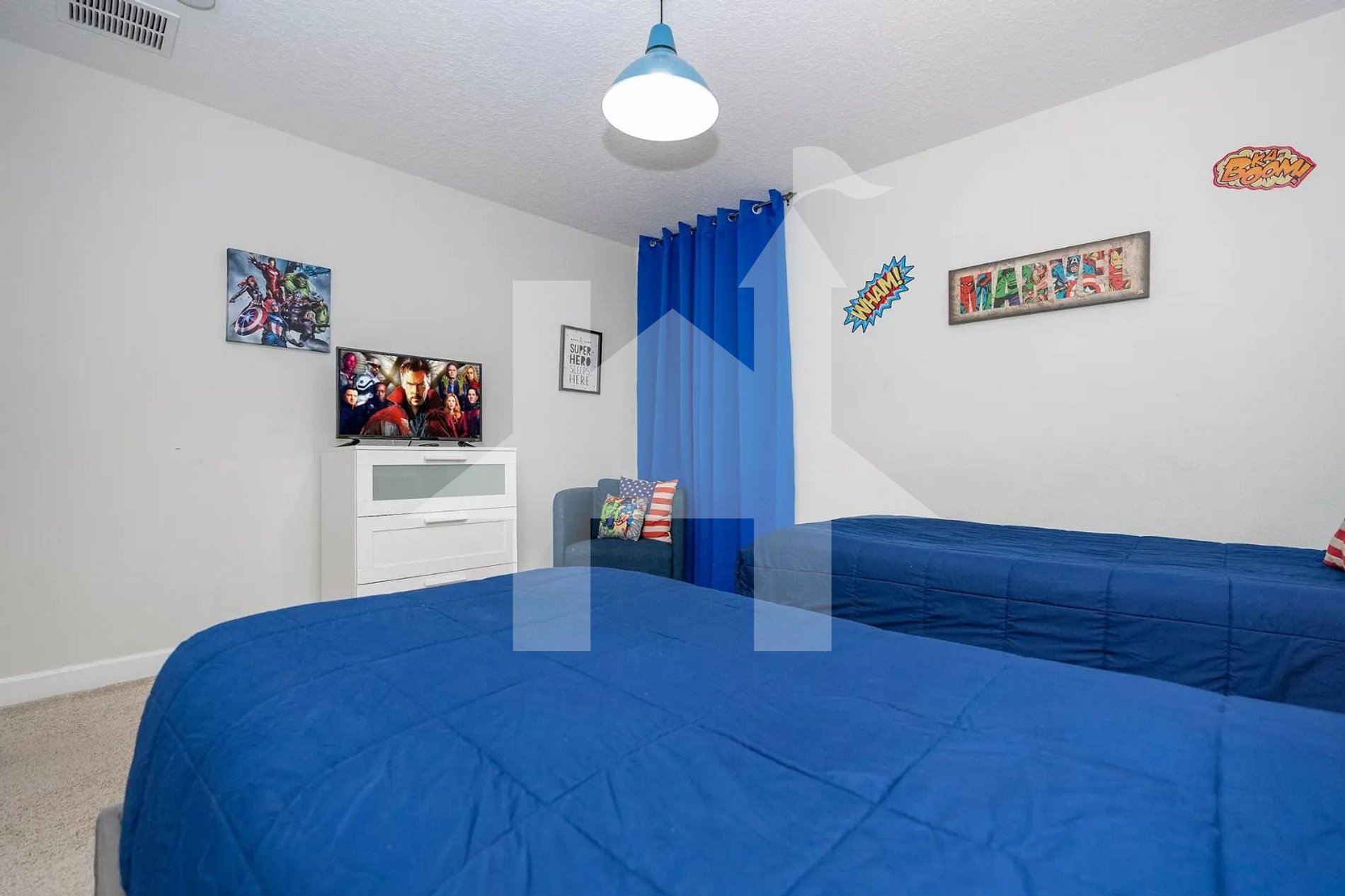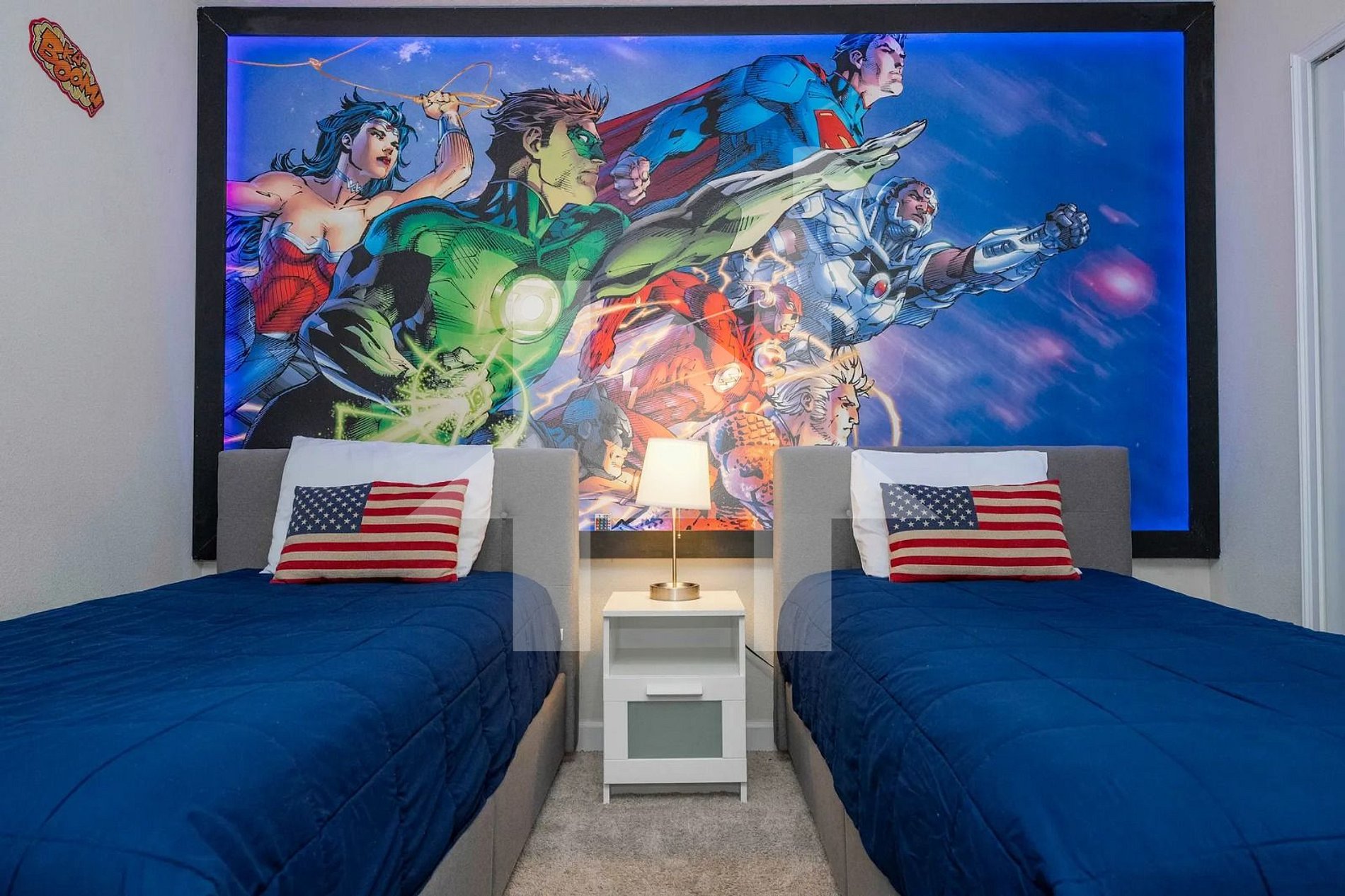 Heroes-themed room: 2 twin beds
