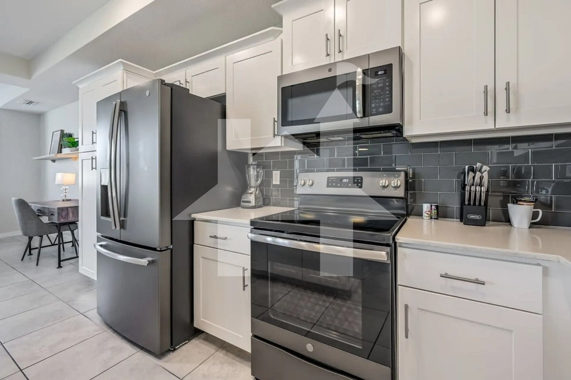 The kitchen is fully equipped with stainless steel appliances, cookware, utensils, dishes, glasses, a coffee maker, and a dishwasher — ready for everything from quick breakfasts to home-cooked dinners.