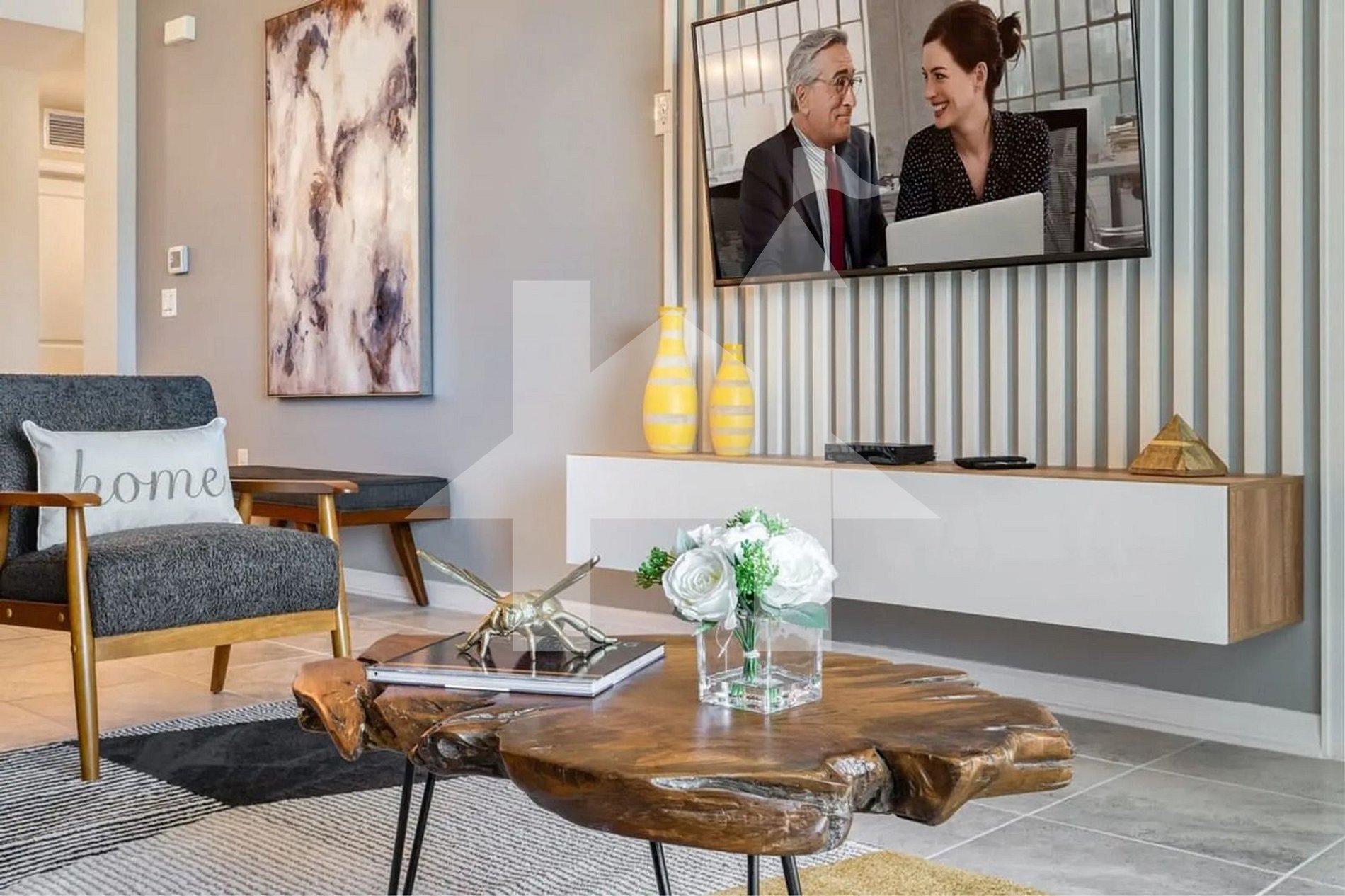 Upon entering, you'll be greeted by a bright and spacious living area adorned with stylish, contemporary décor and large windows that let in natural light throughout the day.