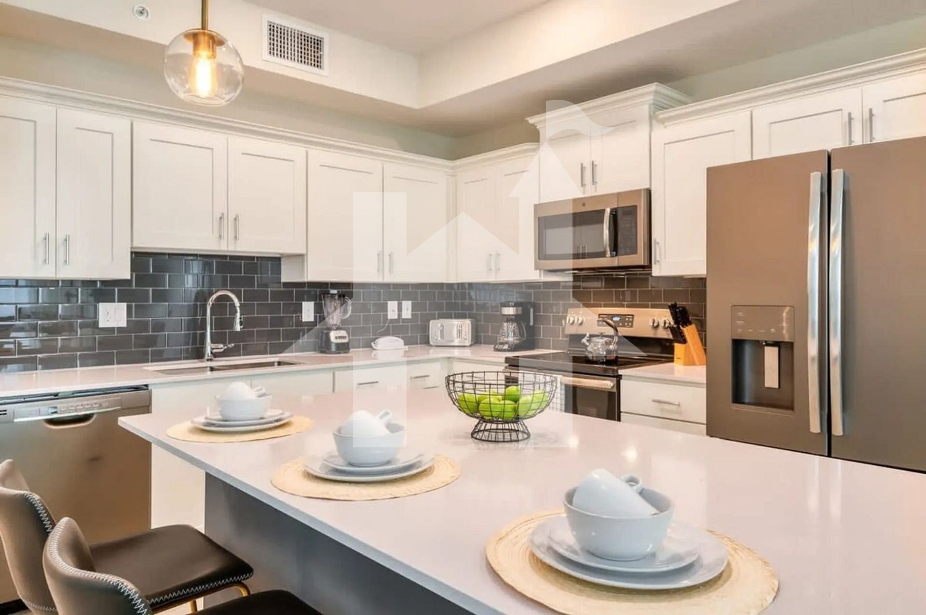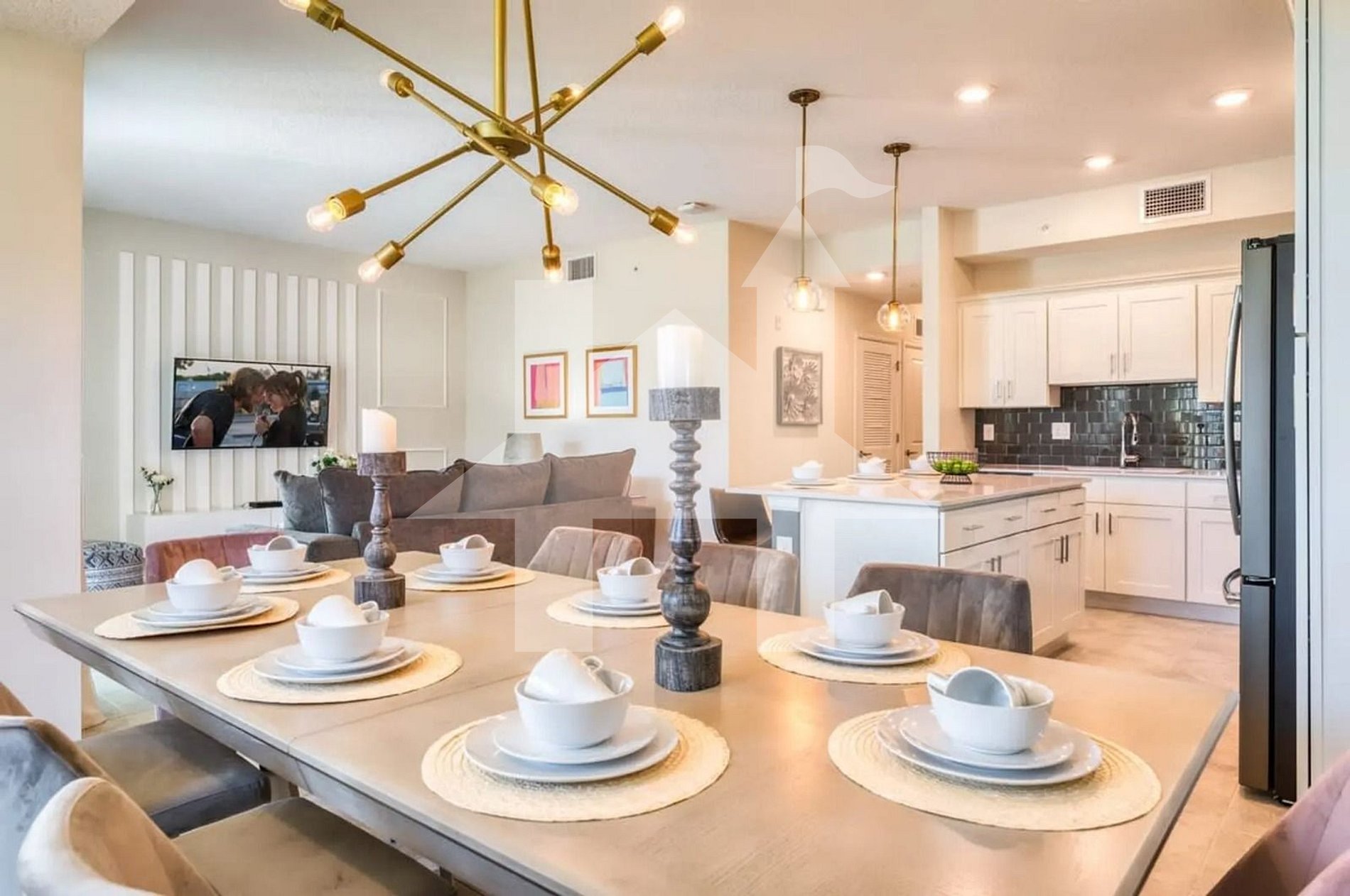 As you walk in, you’re greeted by a spacious and beautifully lit living room, featuring a plush sofa bed and a large smart TV the perfect setup for family movie nights or quiet relaxation. The open-concept layout flows seamlessly into the elegant dining area and the fully equipped kitchen. Outfitted with modern appliances, quality cookware, and a coffee maker, this kitchen is ready to handle anything from a quick breakfast to a home-cooked dinner.