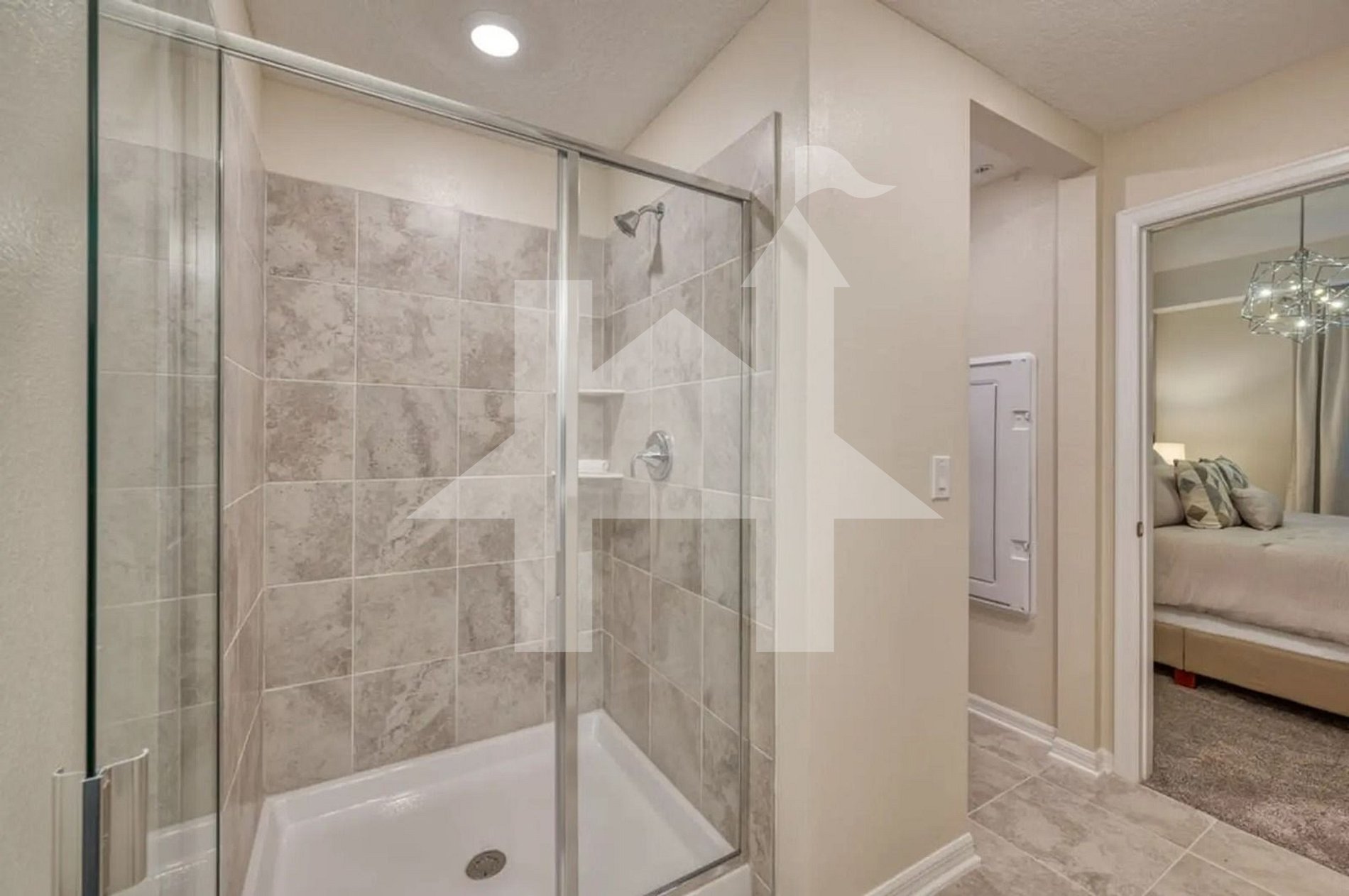 The master suite offers a serene escape, with a luxurious king-size bed, premium linens, air conditioning, a smart TV, and a private en-suite bathroom with a glass-enclosed shower and a spacious vanity. It’s a personal retreat designed for peaceful rest and privacy.
