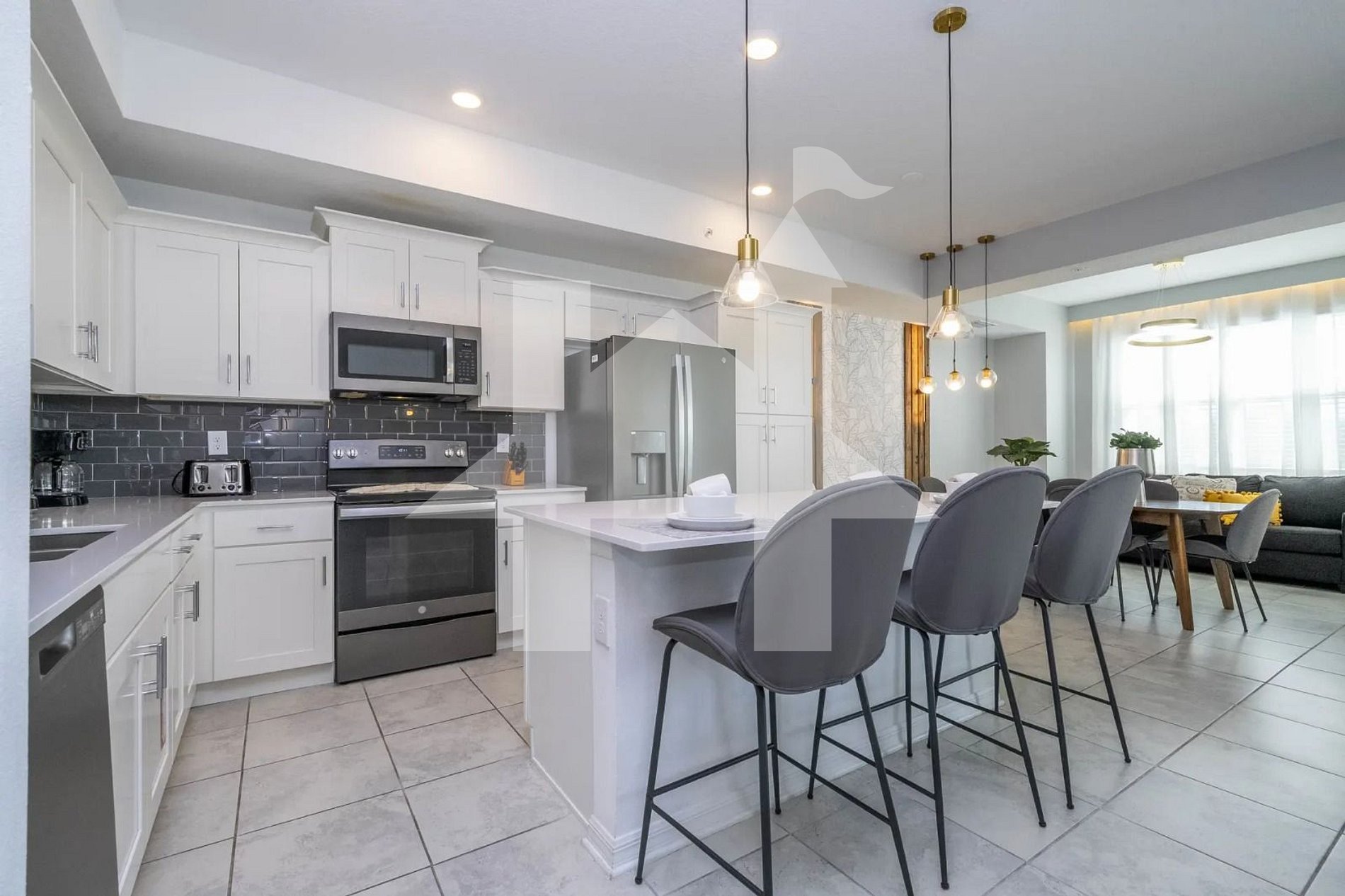 The fully equipped kitchen features modern stainless-steel appliances, including a refrigerator, stove, microwave, and dishwasher. Guests will also find all the necessary cookware, dishes, utensils, and a coffee maker — everything you need to prepare meals at home. The dining area comfortably seats the group for breakfast, dinner, or late-night snacks.