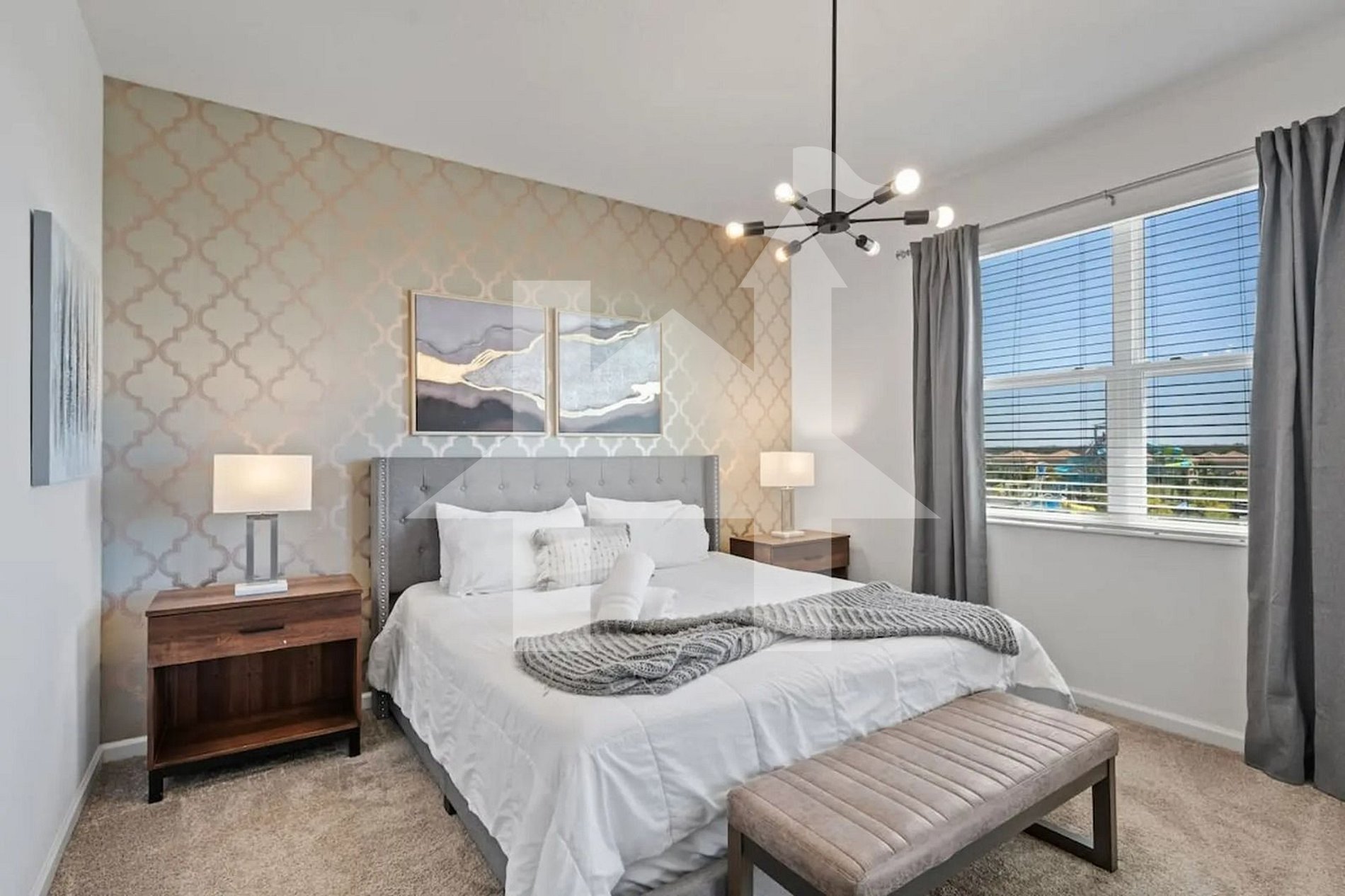 Experience the ultimate comfort in this stylish 3-bedroom, 2-bathroom condo in Champions Gate Resort! Stay in an elegant and spacious setting with an open-concept living room, a fully equipped kitchen, and a dining area. Accommodates up to 9 guests, featuring a king suite, a Star Wars-themed room, and a beautifully decorated third bedroom. Enjoy breathtaking balcony views. The resort boasts a clubhouse, water park, mini-golf, and is just 20 min from Disney!